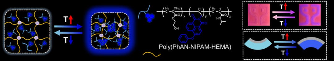 萘酰亞胺是一類非常有趣的熒光基團(tuán),其發(fā)光性質(zhì)與分子結(jié)構(gòu)緊密相關(guān)。一般而言,具有平面結(jié)構(gòu)的N取代衍生物因較易發(fā)生面面堆積(face-to-face stacking)而多是聚集誘導(dǎo)猝滅型熒光團(tuán);而芳環(huán)上有剛性大位阻取代基的萘酰亞胺衍生物因其螺旋槳狀(propeller)的分子構(gòu)象,因此多呈現(xiàn)聚集誘導(dǎo)發(fā)光性能。得益于其獨(dú)特發(fā)光性能以及極易裁剪修飾的分子結(jié)構(gòu),萘酰亞胺功能化聚合物和納米材料廣泛應(yīng)用于分子識(shí)別、傳感檢測(cè)、生物成像等領(lǐng)域。最近,中國科學(xué)院寧波材料技術(shù)與工程研究所智能高分子材料團(tuán)隊(duì)的陳濤研究員、路偉研究員及合作者將功能化萘酰亞胺熒光團(tuán)引入智能高分子交聯(lián)網(wǎng)絡(luò)中,獲得了一種溫敏性聚集誘導(dǎo)發(fā)光高分子水凝膠,并嘗試開展其熒光圖案調(diào)控和仿生驅(qū)動(dòng)應(yīng)用研究。如圖1所示,研究人員首先制備了一種含有苯氧基取代萘酰亞胺熒光團(tuán)的AIE型溫敏性聚合物,隨后將其引入化學(xué)交聯(lián)聚N-異丙基丙烯酰胺交聯(lián)網(wǎng)絡(luò)中以構(gòu)建具有半互穿網(wǎng)絡(luò)結(jié)構(gòu)的聚集誘導(dǎo)發(fā)光高分子水凝膠。研究表明,該水凝膠的發(fā)光和透光性能均具有典型的溫度響應(yīng)性。基于這一發(fā)現(xiàn),研究人員構(gòu)建了多個(gè)具有雙層復(fù)合結(jié)構(gòu)的顯示器和驅(qū)動(dòng)器,初步實(shí)現(xiàn)了溫度響應(yīng)性的熒光圖案調(diào)控和仿生變形/變色功能。該工作不僅豐富了熒光高分子水凝膠的種類,也初步展示了其在防偽、顯示及驅(qū)動(dòng)等方面的潛在應(yīng)用。