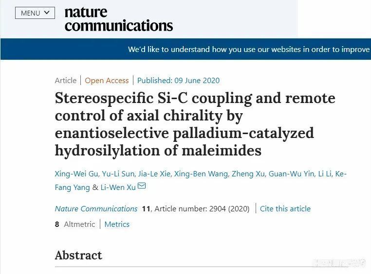 近日,材料與化學化工學院/有機硅化學及材料技術實驗室徐利文教授團隊在Nature旗下子刊Nature Communications(2018 IF:11.878)發(fā)表了題為“Stereospecific Si-C Coupling and Remote Control of Axial Chirality by Enantioselective Palladium-Catalyzed Hydrosilylation of Maleimides”的研究成果。