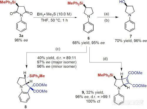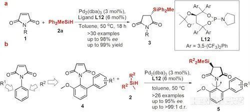 在Nature Communications上發(fā)表研究成果硅氫加成反應是有機硅化學領域中最為重要的反應之一,也是有機硅材料工業(yè)中已得到廣泛應用的基本反應之一,如硅烷偶聯(lián)劑與硅橡膠等產品技術均涉及到硅氫加成反應。但烯烴或炔烴的立體選擇性硅氫加成反應過程仍然是具有挑戰(zhàn)性的反應體系之一,特別是隨著手性有機硅功能材料與開發(fā)含硅藥物分子的發(fā)展需要,不對稱催化硅氫加成反應的重要性越發(fā)凸顯,近年來已成為有機硅化學的前沿熱點之一。目前,已知多種手性金屬催化體系可用于解決末端烯烴和炔烴的不對稱硅氫化反應,但非端烯或類似物的不對稱硅氫化反應極為少見。同時,對于羰基取代的活性烯烴參與的不對稱硅氫化反應更是鮮有報道,其挑戰(zhàn)性不僅在于立體選擇性的控制,而且其化學選擇性難以有效控制,易于產生大量結構不同而難以分離的副產物,致使相關反應過程的實用性較差。迄今為止,關于不飽和羰基烯烴化合物的高立體選擇性不對稱硅氫化反應尚未見報道。近期,課題組首次實現(xiàn)了馬來酰亞胺衍生物的不對稱催化硅氫加成反應,建立了高效的鈀/膦配體催化體系,能夠高化學選擇性及立體選擇性地構建了含碳手性中心的硅基酰亞胺產物(up to 99%ee),并具有較為理想的底物普適性。與此同時,團隊還進一步利用芳香胺N-鄰位的大位阻取代基產生的阻轉異構現(xiàn)象,考察了不對稱硅氫加成反應遠程誘導構建阻轉異構手性的催化過程,發(fā)現(xiàn)鈀催化的不對稱硅氫加成反應可一步構建含碳手性中心和C-N軸手性。建立的最佳反應條件可適用于一系列N-苯基2,6位鄰位取代的馬來酰亞胺,同樣有著良好的收率和優(yōu)異的選擇性(up to 95%ee和>99:1 dr),這些既含碳手性中心又含軸手性的阻轉異構體易于分離獲取。該方法為構建非聯(lián)芳類阻轉異構體提供了一種遠程手性控制新策略,具有潛在的應用價值。團隊還對反應機理進行了深入考察,為鈀催化體系的高立體選擇性控制能力提供了理論依據(jù)。在本項研究工作中,團隊基于已建立的不對稱硅氫加成反應體系,對其在合成復雜分子方面的應用價值進行了研究。利用硅介導的氧化反應或硅的占位效應等合成了手性氨基醇、手性雜環(huán)等一系列新型含氮物質,特別是在光催化環(huán)加成反應體系中,充分展示了手性硅基團在誘導構建新手性中心的增效作用,顯示出硅介導合成策略可填補常規(guī)光催化難以構建手性中心的缺憾,展示出有機硅化學在合成化學中的巨大潛力。有機硅實驗室2018級碩士生顧幸威為論文第一作者,徐利文教授為通訊作者。該工作得到了國家自然科學基金項目和浙江省自然科學基金重點項目、化學A類一流學科等項目經費的支持。