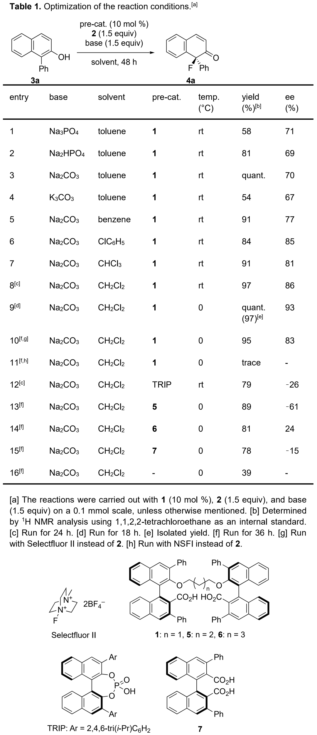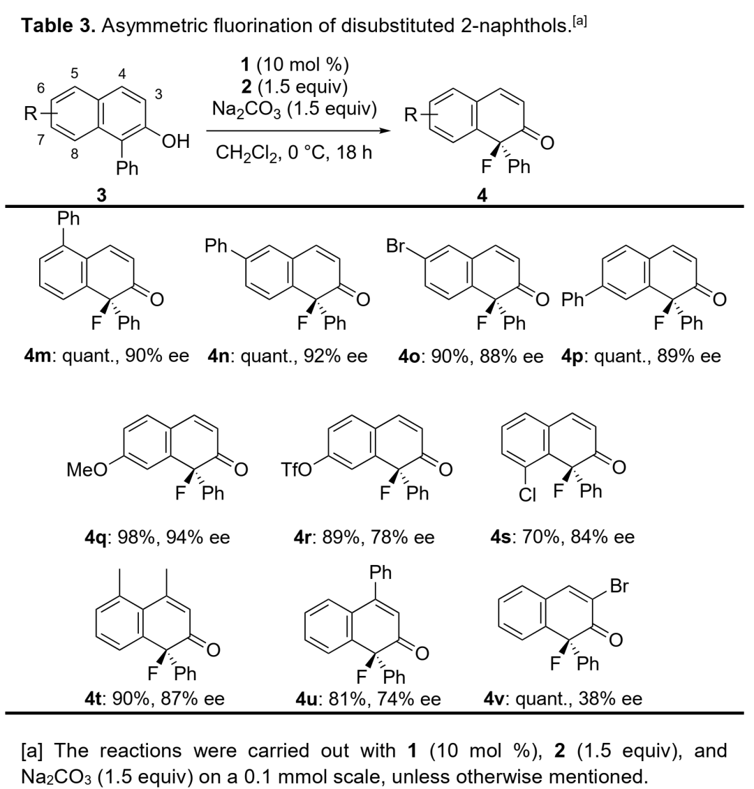 作者以1-苯基-2-萘酚3a為模板底物,通過(guò)對(duì)溶劑、堿和溫度等條件進(jìn)行篩選,確定最優(yōu)條件為(Table 1):1.5 equiv氟試劑2為氟源,10 mol%二羧酸鹽相轉(zhuǎn)移催化劑1為最優(yōu)催化劑,1.5 equiv Na2CO3為最優(yōu)堿,CH2Cl2為最優(yōu)溶劑,在0 ℃條件下反應(yīng)18 h,能以97%的收率和93%的對(duì)映選擇性得到相應(yīng)產(chǎn)物。
