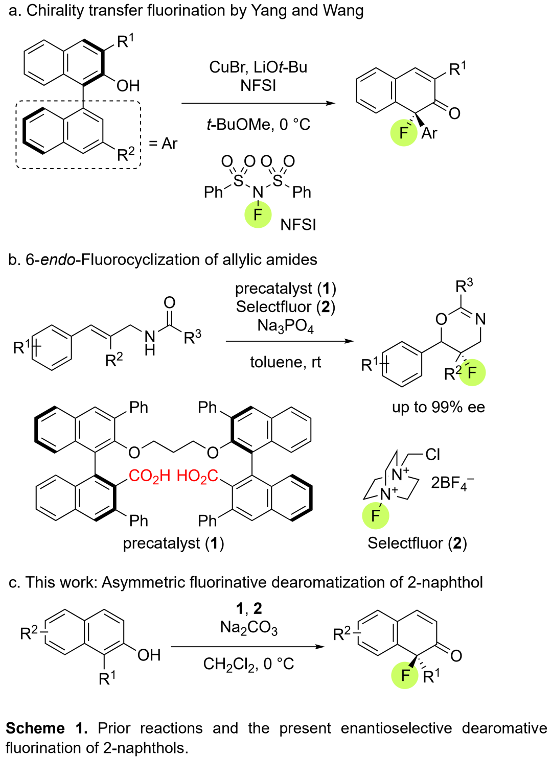 有機(jī)氟化物廣泛存在于具有藥理活性的藥物和農(nóng)藥中,因此該類化合物的不對(duì)稱合成具有重要意義。盡管已經(jīng)有許多關(guān)于合成不對(duì)稱氟化物的報(bào)道,但應(yīng)用去芳構(gòu)化策略合成芳基氟化物的報(bào)道還很少。2-萘酚是不對(duì)稱去芳構(gòu)化反應(yīng)中的重要底物,那將2-萘酚用于不對(duì)稱去芳構(gòu)化氟化反應(yīng)似乎較為簡(jiǎn)單。2013年,Toste課題組報(bào)道了手性磷酸鹽相轉(zhuǎn)移催化劑催化苯酚的不對(duì)稱去芳構(gòu)化氟化反應(yīng)。2018年,王銳和楊東旭團(tuán)隊(duì)報(bào)道了銅催化軸手性1-取代-2-萘酚的不對(duì)稱手性轉(zhuǎn)移型去芳構(gòu)化氟化反應(yīng)(Scheme 1a)。同時(shí),受到課題組前期報(bào)道的二羧酸相轉(zhuǎn)移催化劑催化烯丙基酰胺的不對(duì)稱氟環(huán)化反應(yīng)(Scheme 1b)的啟發(fā),日本靜岡大學(xué)Yoshitaka Hamashima團(tuán)隊(duì)首次報(bào)道了二羧酸鹽相轉(zhuǎn)移催化劑1催化2-萘酚的不對(duì)稱去芳構(gòu)化氟化反應(yīng),并以良好至優(yōu)秀的收率和對(duì)映選擇性得到一系列手性氟化萘酮衍生物(Scheme 1c)。相關(guān)研究成果發(fā)表于Angew. Chem. Int. Ed.(DOI: 10.1002/anie.202005367)。