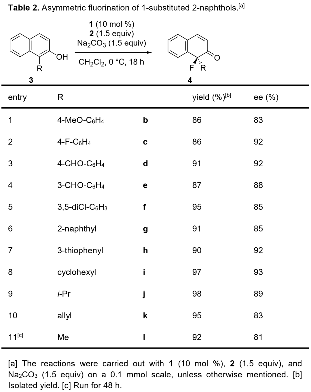 在最優(yōu)反應(yīng)條件下,作者對(duì)1-取代-2萘酚的底物范圍進(jìn)行了考察(Table 2)。各種取代的苯基、烯丙基、芳香醛、雜芳基、環(huán)己烷以及異丙基等脂肪族取代的2-萘酚均能較好地適應(yīng)反應(yīng)條件,以良好至優(yōu)秀的收率及對(duì)映選擇性得到相應(yīng)的手性氟化萘酮衍生物。同時(shí),2-甲基取代的2-萘酚也能以優(yōu)秀的收率和良好的對(duì)映選擇性得到相應(yīng)產(chǎn)物。