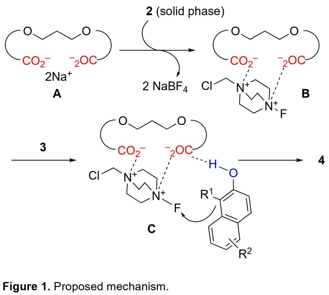 根據(jù)反應(yīng)結(jié)果,作者推測(cè)可能的機(jī)理如下(Figure 1):原位生成的二羧酸鹽催化劑A與氟試劑2經(jīng)歷離子交換過(guò)程后,2可從固相轉(zhuǎn)移到液相中從而轉(zhuǎn)化為手性氟試劑B。1H NMR實(shí)驗(yàn)表明2-萘酚和羧酸鹽催化劑A之間存在氫鍵相互作用,因此作者推測(cè)B和2-萘酚反應(yīng)可形成三組分中間體C。最后,C發(fā)生分子內(nèi)反應(yīng)生成產(chǎn)物4。同時(shí),4a的單晶結(jié)構(gòu)顯示產(chǎn)物為S-構(gòu)型。