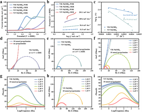 ▲Figure 3. Electrochemical measurement. (a) The normalized polarization curves and (b) the corresponding Tafel plots. (c) Arrhenius plot. (d) Nyquist plots for VR-Ni(OH)2 in 1m KOH with and without 10 mmol propylamine at 1.4 V (vs RHE). (e) Nyquist plots for VR-Ni(OH)2 and for VP-Ni(OH)2 catalysts in 1 M KOH with 10 mmol propylamine at 1.4 V (vs RHE). (f) The corresponding Nyquist plots and (g) Bode phase plots of VR-Ni(OH)2 at various voltages in 1 M KOH with 10 mmol propylamine. (h) Nyquist plots for VP-Ni(OH)2 and (i) Bode phase plots of VP-Ni(OH)2 at various voltages in 1 M KOH with 10 mmol propylamine.