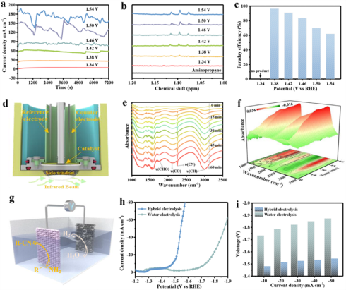 以正丙胺為例,研究了富空位Ni(OH)2和貧空位Ni(OH)2的電催化伯胺性能。電化學測試表明:受益于富空位Ni(OH)2具有較小的正丙胺活化動力學勢壘、更好的電導率和更快的電荷轉移速率,富空位Ni(OH)2展現出了最優的正丙胺氧化性能,即起始過電位明顯下降、 Tafel斜率減小、電流密度顯著增加。▲Figure 4. Detection of product and coupling electrolytic water performance. (a) Chronopotentiometric curves of VR-Ni(OH)2 at different potentials in 1 M KOH with 10 mmol propylamine. (b) 1H NMR spectra of the collected product at different potentials. (c) FEs of propionitrile at different potentials. (d) The schematic showing the setup for the in-situ IR experiments. (e, f) in situ FTIR spectra for propylamine electrooxidation of VR-Ni(OH)2. (g) The schematic showing the homemade propylamine electrolyser using VR-Ni(OH)2 as the anode and CoS2-MoS2 as the cathode. (h) Current–potential curves in a two-electrode system in 1.0 m KOH with and without 10 mmol propylamine. (i) The voltage of the electrolyzer required for different current densities