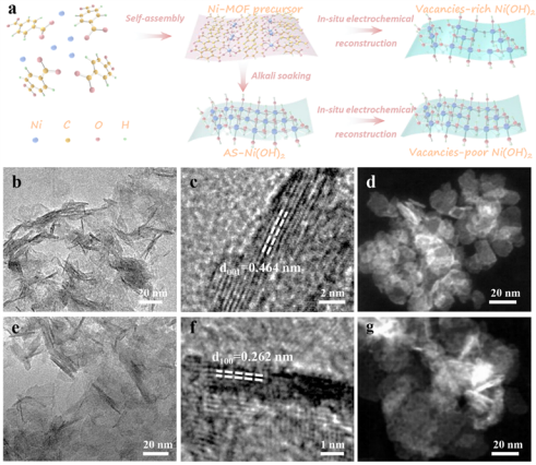論文DOI:10.1002/anie.202005574近日,華中科技大學翟天佑和劉友文團隊與上海光源姜政研究員合作,通過空位調控Ni(OH)2納米片表面的電荷密度,實現了對氫氧化鎳電氧化伯胺的C-N鍵為腈C≡N鍵過程的性能優化。腈是化學和生物學中一類重要的含氮化合物。傳統的腈合成過程大多需要氰化物的參與或高溫條件,無法滿足可持續發展的要求。電催化伯胺脫氫制腈提供了一種清潔、簡單、有效的獲取腈的方法,在工業、農業、醫藥領域具有很大的應用價值。但是,目前對于C-N鍵到C≡N鍵的轉化過程并沒有進行詳細的探究,其轉化機理和性能優化還未受到關注。我們的工作從胺的結構出發,考慮到伯胺的氨基(-CH2-NH2)中,-NH2是采用不等性sp3雜化,其N原子周圍存在孤對電子從而表現出電子聚集。因此,可以通過在催化劑表面構建貧電子位點去化學吸附N原子中的孤對電子并進一步攻擊N-H鍵活化正丙胺分子。在此思路下,我們提出利用空位工程誘導催化劑表面產生貧電子位點,以期實現對伯胺電氧化性能的優化。▲Figure 1. Preparation and characterization for the vacancies-rich (VR) and vacancies-poor (VP) Ni(OH)2 atomic layer. (a) Schematic illustration of controllably synthesized of VR-Ni(OH)2 and VP-Ni(OH)2. (b-d) TEM, HRTEM and HAADF-STEM image of the VP-Ni(OH)2, respectively. (e-g) TEM, HRTEM and HAADF-STEM image of the VR-Ni(OH)2, respectively.