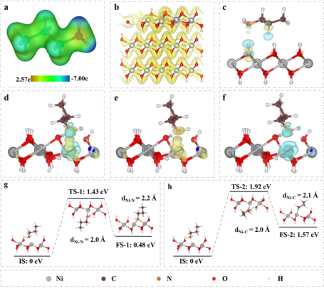 利用核磁共振氫譜和原位傅里葉變換紅外光譜對正丙胺氧化產物進行表征。結果表明:丙腈是正丙胺電氧化的主要產物,實現了伯胺到腈的轉化。結合電化學性能測試和對氧化 產物的分析,證明了富空位Ni(OH)2納米片是正丙胺氧化為丙腈的有效催化劑。▲Figure 5. Theoretical simulation. (a) Electrostatic potential maps of propylamine. (b) Charge density of the VR-Ni(OH)2. (c) The charge density difference in the perfect Ni(OH)2 and the isosurfaces level is 0.000968 au. The yellow and blue isosurfaces represent charge accumulation and depletion in the space. (d) The charge density difference in the VR-Ni(OH)2 and the isosurfaces level is 0.004028 au. (e) The positive charge density difference in the VR-Ni(OH)2. (f) The negative charge density difference in the VR-Ni(OH)2. (g) The reaction route 1 of propylamine electrooxidation. (h) The reaction route 2 of propylamine electrooxidation.