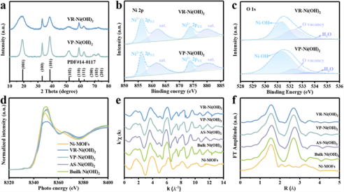 以Ni-MOFs超薄納米片為前驅體,通過原位電化學拓撲轉換實現了富空位Ni(OH)2納米片的成功合成。同時,采用合成富空位Ni(OH)2納米片的方法處理 Ni(OH)2前驅體,獲得了貧空位Ni(OH)2納米片,且通過原位電化學拓撲轉換獲得的富空位Ni(OH)2和貧空位Ni(OH)2均能保持片狀形貌。▲Figure 2. The characterization for vacancy. (a) XRD patterns. (b) XPS Ni 2p spectra. (c) XPS O 1s spectra. (d) Ni K-edge XANES spectra. (e) Ni K-edge EXAFS k3(ck) oscillation functions and (f) the corresponding FT curves