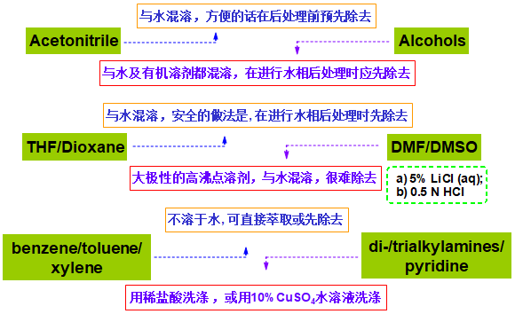 1. 若產物極性較大,可用Hexane或乙醚萃取除去; 2. 加入少量N,N-二甲基丙二胺(或N,N-二甲基乙二胺),待TLC檢測過量的Boc2O(一般10:1, Rf~0.6左右,以碘顯色) 消失后,以1 M稀鹽酸洗滌(如果擔心Boc的安全就用10%的檸檬酸洗)。