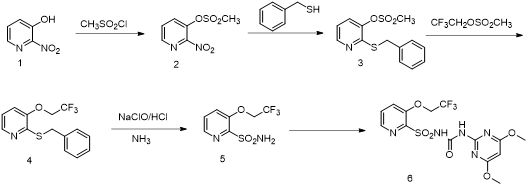 在已有的合成路線的基礎上,筆者同樣選用不保護羥基的方法,以2-硝基-3-羥基吡啶為起始原料,首先和甲磺酰氯反應,然后和芐硫醇發生親核取代,和2,2,2-三氟乙基甲磺酸酯發生醚交換,再經過次氯酸鈉的氧化,氨氣氨化得到目標中間體,最后和2-氨基-4,6-二甲基嘧啶偶聯得到三氟啶磺隆。