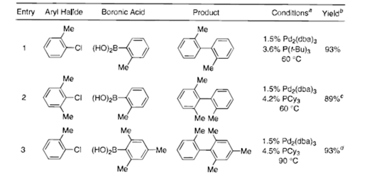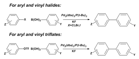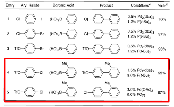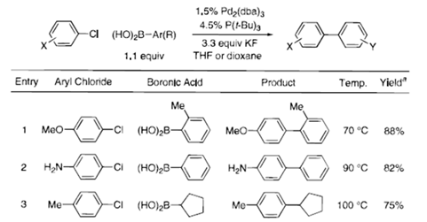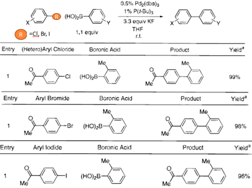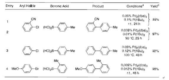 Pd2(dba)3/P(t-Bu)3作為催化劑,在室溫的條件下,對于芳基鹵代物(氯代物也可以)和芳基硼酸的偶聯(lián)反應都有很好的收率。