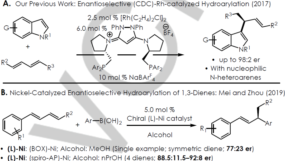 Simon J. Meek團隊曾經報道過(CDC)-Rh-絡合物促進的,N-雜芳烴與末端或內部1,3二烯的位點和對映選擇性反應(Scheme 1A),但是反應底物僅限與親核的芳烴。之后,中國科學院上海有機化學研究所的梅天勝研究員和南開大學周其林教授分別使用N,N和N,P雙齒配體,實現了對映選擇性轉化(Scheme 1B),但是這些反應的底物范圍非常有限,并且產物的對映選擇性較低