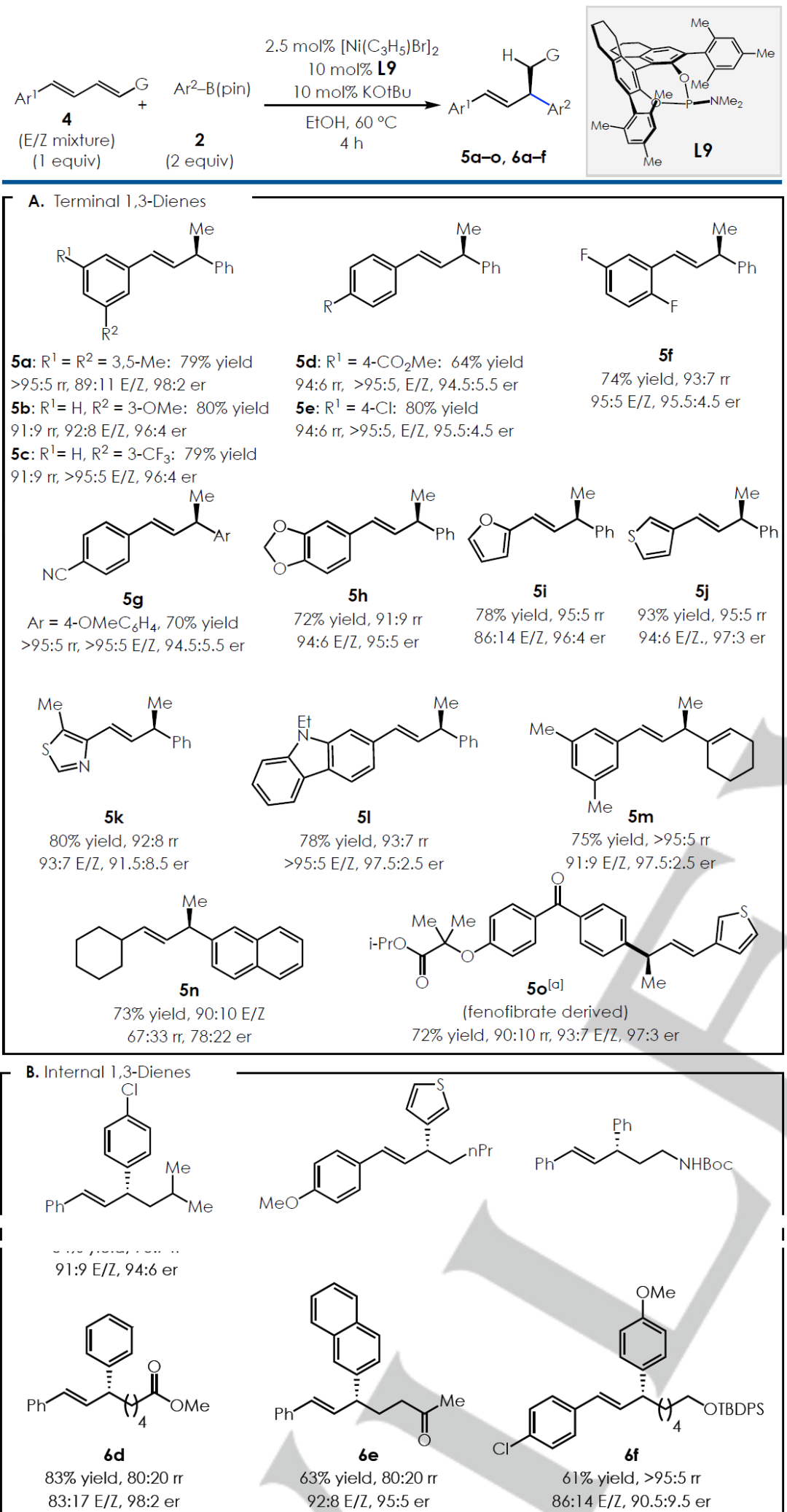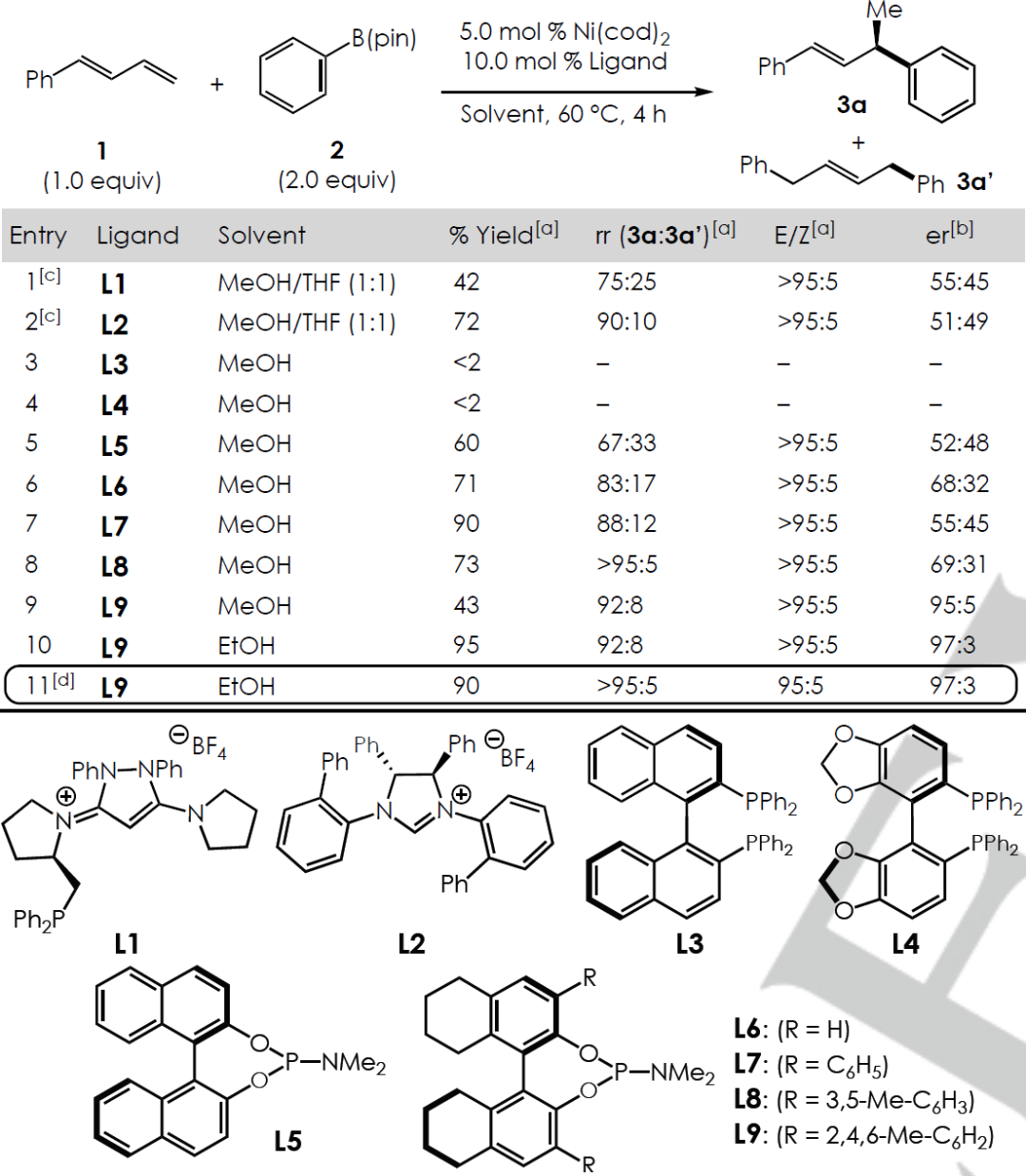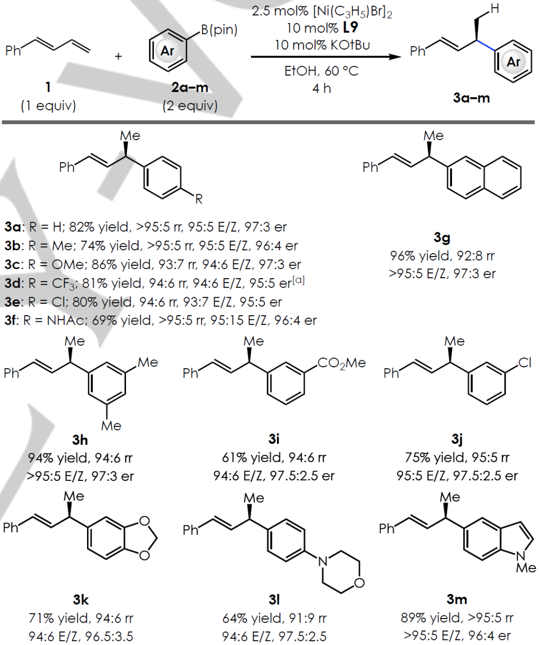 作者首先以苯基丁烷-1,3-二烯和苯基-B(pin)為底物,以5.0 mol % Ni(cod)2為催化劑,MeOH為溶劑,反應溫度為40℃,篩選最佳的配體(Table 1)。碳二卡賓配體(L1)和氮雜卡賓配體(L2)的對映選擇性較低,但是L2較L1的位置選擇性高。而雙齒磷配體(L3-L4)產率較低而難以用于反應(﹤2%)。相反,單齒亞磷酰胺配體(L5-L6)提高了反應的對映選擇性和位點選擇性,作者通過在配體L6二醇主鏈上引入3,3’-a芳香基團(L7-L9),發現空間位阻較大的配體L9的rr和對映選擇性都得到了進一步提高,但是產率相應的降低。最后作者以乙醇為溶劑,發現[Ni(C3H5)Br]2和KOtBu組合,反應的位點選擇性和對映選擇性最優。
