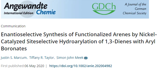 近期,美國北卡羅來納大學教堂山分校化學系Simon J. Meek等人報道了一種高效的Ni-催化對映選擇性加氫芳基化反應,該反應的較好的官能團容忍性,能夠合成大量手性芳烴。相關成果發表在Angew. Chem. Int. Ed.。