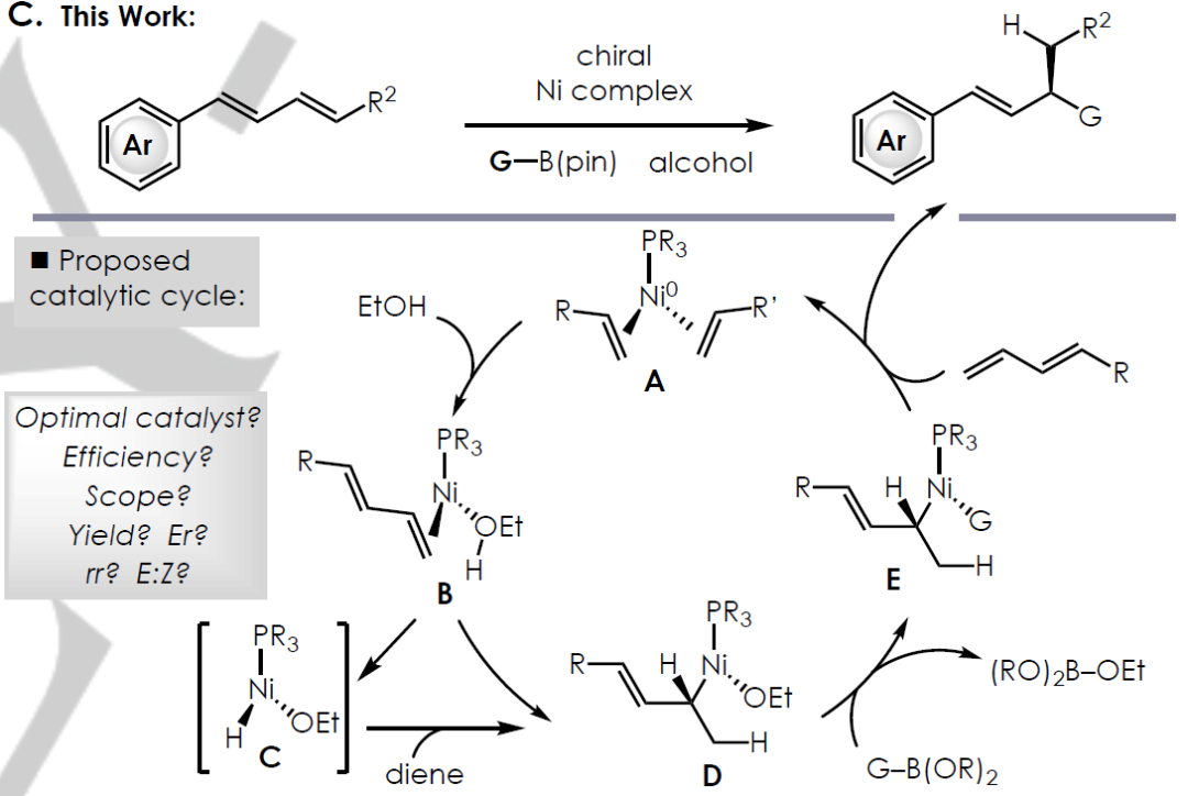 小結:Simon J. Meek課題組報道了通過Ni催化1,3-二烯的對映選擇性加氫芳基化反應生成官能化的芳烴的反應。該反應對鹵化芳烴,雜環,路易斯堿等官能團具有較好的容忍性。反應是通過E/Z立體匯聚(stereoconvergent)的對映選擇性過程進行的,該過程受芳基硼酸酯的影響。