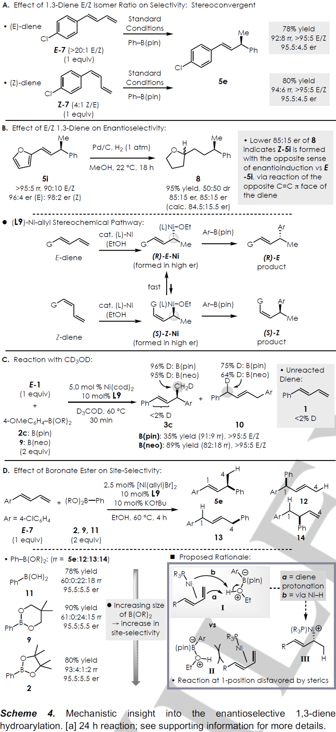 在研究機理的時候作者提出以下幾個問題:(1) 鎳催化劑在加氫芳基化之前是否使E/Z二烯混合物異構化;(2) 如果反應是在氘代醇中進行的,則在哪個位置(如果有)摻入了氘?(3) 硼試劑的結構是否影響反應的選擇性?