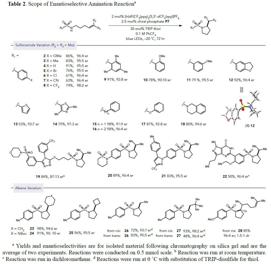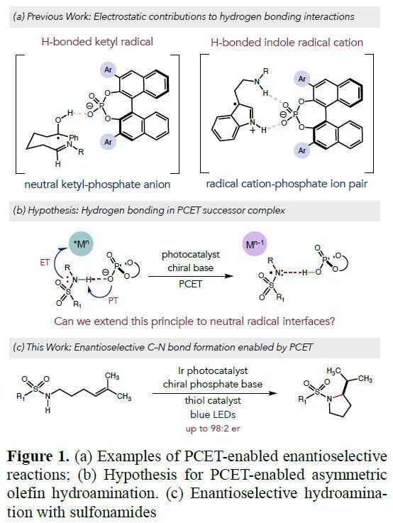 在自然界以及實驗室中,運用非共價相互作用來控制反應的立體選擇性是一種強有力的手段,然而,由于對這些弱相互作用的作用模式還沒有明確的理解,也限制了其在不對稱自由基化學中的應用。目前已經報道的通過氮自由基形成碳氮鍵的合成方法中,都是利用底物跟手性催化劑之間強的相互作用。近日,美國普林斯頓大學Robert R. Knowles課題組報道了以手性磷酸跟底物形成氫鍵的作用方式,通過質子偶聯電子轉移實現分子內磺酰胺對烯烴的對映選擇性氫胺化。