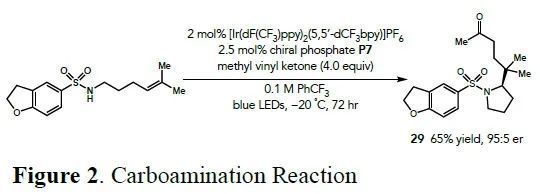 為了進一步研究這一轉化過程中的立體選擇性控制步驟,作者又設計了底物的胺化反應。用甲基乙烯基酮代替之前使用的硫醇共催化劑,反應得到的碳胺化產物29與之前同一磺酰胺底物反應得到的氫胺化產物的對映選擇性近乎一樣,由此作者認為在這兩個轉化中相同的碳氮鍵形成步驟是反應的立體選擇性控制步驟(Figure 2)。