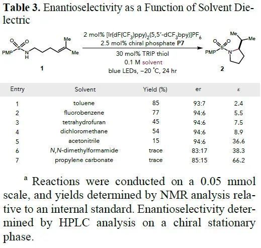 最后,作者又嘗試了極性不同的溶劑來測試其對反應立體選擇性的影響。結果顯示,雖然在強極性溶劑中反應的活性大大降低,但立體選擇性在極性和非極性溶劑中都得到很好的保持。反應對溶劑極性不敏感也否定了碳氮鍵形成過程中產生離子對中間體的可能性(Table 3)。