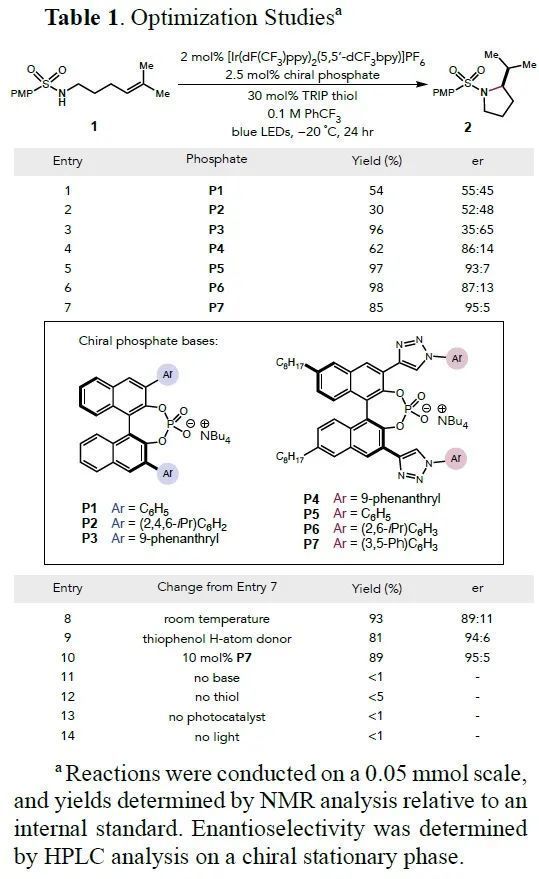 根據之前已經報道的關于質子偶聯電子轉移(PCET)在氮雜頻哪醇環化以及吲哚氧化活化中的應用(Figure 1a),作者提出,如果使用手性磷酸(Figure 1b),有望將這一方法應用在課題組之前報道的烯烴的分子內氫胺化反應中,從而實現不對稱轉化(Figure 1c)。
