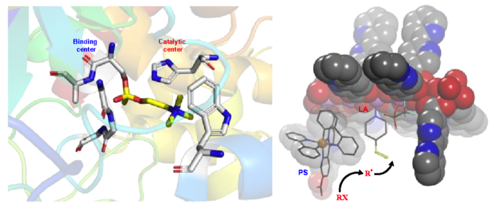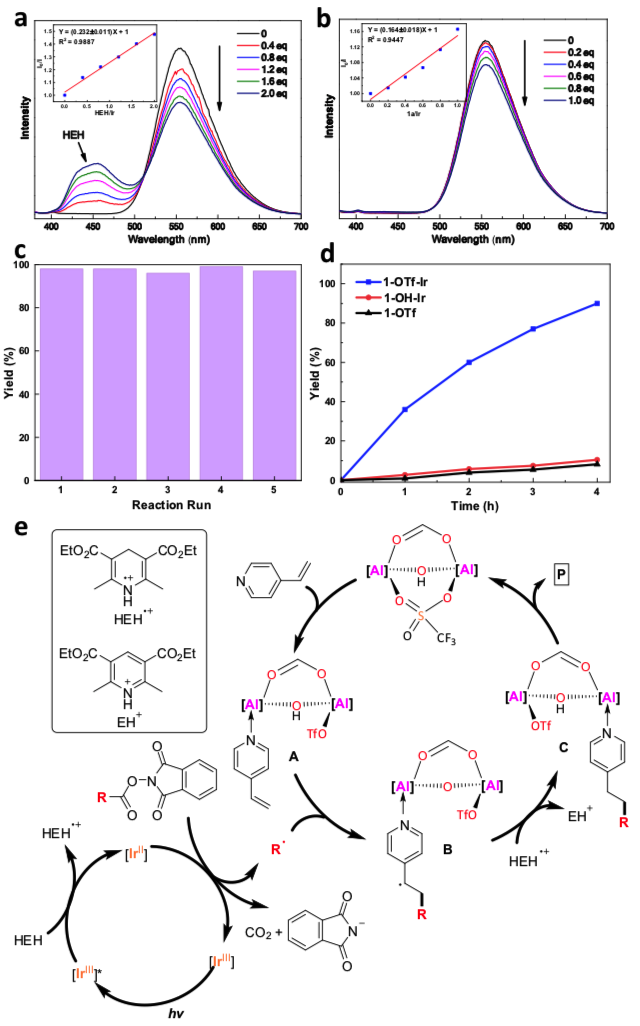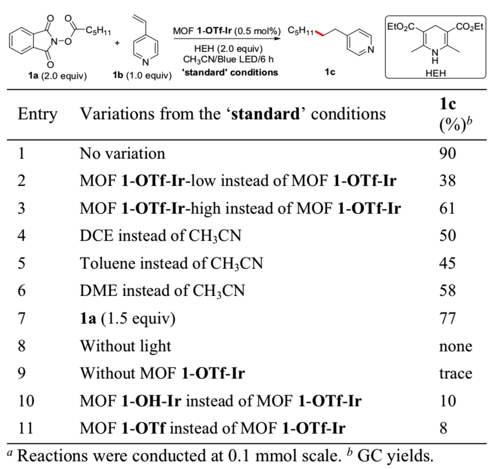 芝加哥大學林文斌、廈門大學汪騁等報道報道了模擬酶結構的金屬有機框架化合物的合成,將強Lewis酸位點和光還原催化位點組裝到MOF中,通過將1,4-苯二丙烯酸酯、2,2′-聯吡啶-5,5-二羧酸酯通過O3氧化,隨后通過TfOH處理,得到強Lewis酸性的Al-OTf位點,隨后將[Ir(ppy)2(dcbpy)]+引入,實現了MOF中同時具有強Lewis酸位點和光還原Ir催化位點,該催化劑可用于N-羥基鄰苯二甲酰亞胺酯/芳基溴甲基酮和炔基氮雜芳烴/乙烯基氮雜芳烴反應,得到氮雜芳烴物種。該催化劑在合成非尼拉敏、氯苯那敏等藥物分子中展現了反應活性。