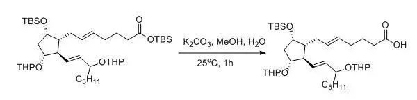 三、上述兩種方法都是比較強(qiáng)的條件,羥基的TBS保護(hù)基也可以直接脫去。但在碳酸鉀的條件下,可以選擇性脫去硅酯的硅基。碳酸鉀,甲醇,水,25℃,1h,88%收率。【J. Org. Chem., 43, 2102(1978)】