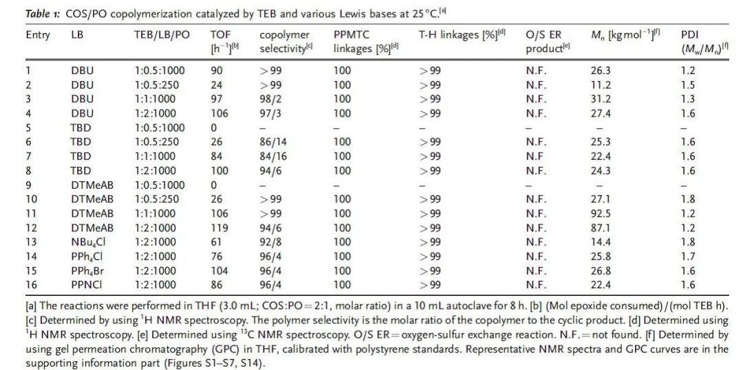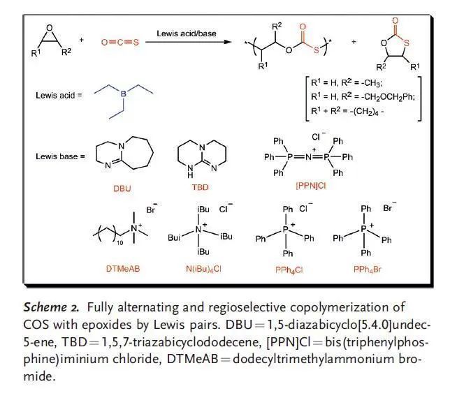 給大家分享一篇2015年發表在Angewandte Chemie International Edition上的文章,題為:Perfectly Alternating and Regioselective Copolymerization of Carbonyl Sulfide and Epoxides by Metal-Free Lewis Pairs,在本研究中作者利用脒,胍和季鎓鹽作為Lewis堿;三乙基硼烷(TEB)作為Lewis酸組成無金屬Lewis酸堿對,催化羰基硫(COS)和環氧烷烴完全交替和區域選擇性共聚,成功地獲得了高透明性的聚(單硫代碳酸酯),其尾-頭連接含量超過99%,分子量高達92.5 kg/mol。在大多數情況下O/S交換被有效地抑制,在室溫下TOF值可達119 h-1。本文的通訊作者是浙江大學的張興宏教授。