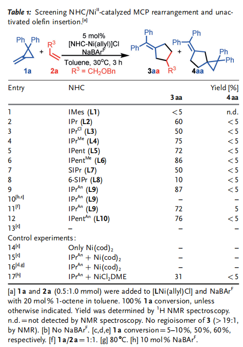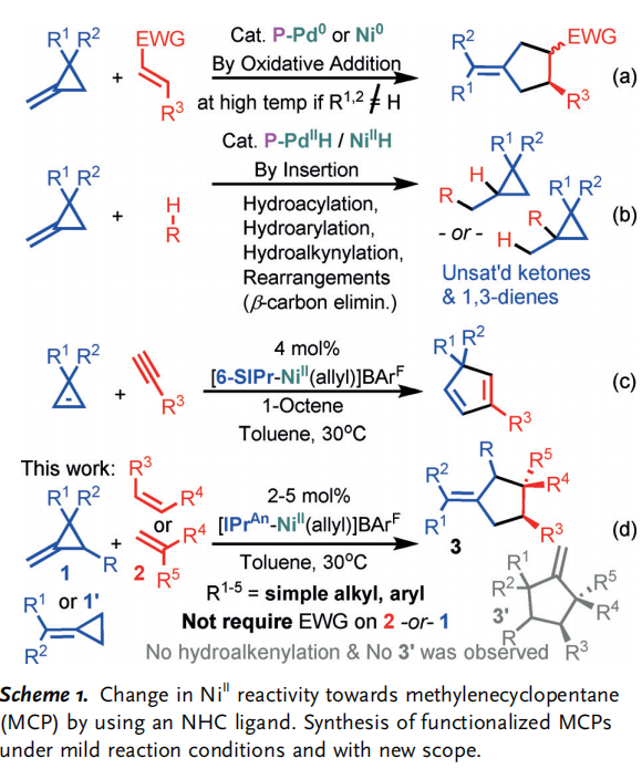 亞甲基環丙烷(1:MCP)是有機合成中的一個重要組成部分,近年來新的過渡金屬催化劑在其活化方面取得了重大進展 (Scheme 1)。除了使用傳統的方法,如光活化和熱重排,一些專門的MCPs,催化劑如 P/Pd0 和Ni0(AN)2(AN = Acrylonitrile),在1(近端或遠端位置)的氧化開環反應中特別有效,從而與烯烴(2)形成有效的C-C鍵。這一策略是獲得功能化環戊烷的最重要途徑之一 (3; Scheme 1 a)。然而,只有電子貧乏或小烯烴是分子間反應的有效伙伴。未活化或體積較大的烯烴即使在高溫下使用較長的反應時間也往往失效,這已被認為是實現更高選擇性和產品結構多樣性的關鍵障礙。插入金屬氫化物或其等價物代表另一種常見的MCP激活策略 (Scheme 1 b)。中間體,如環丙基甲基-Ni/PdII,經常進行β碳消除或其他合作伙伴的插入,為構建氫功能化產品提供了一條通用路線。最近,[NHC-Ni(allyl)]BArF (NHC = N-heterocyclic carbene)被認為是一種通過環丙烷和烯烴的交叉氫烷基化催化劑,它涉及環丙烷開環。因此,我們對用于MCP激活的[NHC-Ni(allyl)]BArF感興趣。