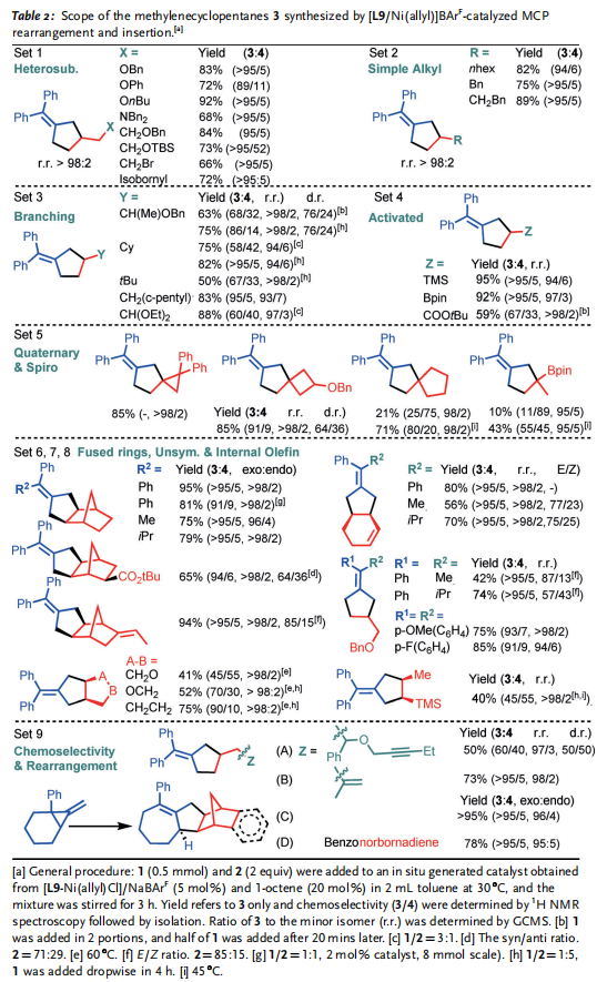 在此,首先使用[NHC-Ni(allyl)]BArF催化劑實現了1和2的環化反應(Scheme 1 d)。它提供了一種新的、高效的合成高價值和功能化的亞甲基環戊烷3的途徑。與幾種高度競爭的交叉氫烷基化反應形成鮮明對比。使用Pd0或Ni0之前沒有被證明的1和2的幾種組合(Scheme1a)現在是兼容的并且在環境條件下反應。并發癥,如不希望消耗1和2的非選擇性的同質反應/低聚,如許多相關的氫化物系統,和/或快速異構化被抑制。它避免了競爭的MCP開環[2+2]或[3+3],或將MCP插入Ni0,以及在使用AuI時重排成環丁烯等問題,所有這些都與其他的MCP反應有關。值得注意的是,對照實驗表明,3的形成不是NHC加速Ni0氧化加成1的結果,這一觀察結果與用NHC代替P所假定的反應活性明顯不同。他們的結果表明,NHC/NiII催化1的有效重排,從而達到了無可比擬的反應性、新的范圍、高選擇性和效率。作者的研究從一個簡單的MCP,1a和末端烯烴2a開始,使用[NHC-Ni(allyl)]BArF催化劑報道的環異構化和氫烷基化(Table 1, entry 2)。令人驚訝的是,沒有觀察到假定的交叉氫烷基化或β-碳消除產物,但首次觀察到一種新的[3+2]產物(3aa)。篩選NHCs表明NHCs在這種催化作用中起著重要的作用,使用空間體積大的NHC對所需的反應性至關重要(Figure 1; Table 1,entries 1–9, 12–13)。然而,NHC空間效應對高化學-(3aa/4aa)和區域選擇性(沒有其他區域異構體的核磁共振波譜)的影響尚不清楚。在那些結構多樣化,提供了所需的反應性的NHCs中,沒有發現明顯的趨勢。首先,假設3的形成是典型的MCP激活Ni0的結果,無論是從Ni0殘基還是在催化劑合成過程中意外的原位NiII還原。然而,使用Ni0的對照實驗表明,在溫和的反應條件下,不能形成3aa (entry 14)。此外,盡管對結構優化的NHCL9進行了鑒定,但在相同的反應條件下,相應的Ni0/L9即使在80℃下也沒有期望的反應活性 (entries 9, 15, and 16)。在沒有NHC配體或BArF作為陰離子的情況下,觀察到1a和2a的低或非選擇性轉化(entries 10 and 13)。此外,L9/NiCl2的表現甚至優于L9/Ni00 (entry 17)。值得注意的是,這里沒有觀察到3’aa(Scheme 1d)。這是在環丙烷(CP)環和丙烯酸酯上存在不平衡的MCPs的相關Ni0體系中注意到的主要異構體(Table 2)。總之,從Ni0獲得的上述結果表明,3aa在這里的形成不太可能是NHC輔助Ni0氧化加成MCP的結果 (Scheme 1a)。最后,應該指出,陰離子對反應活性有顯著的影響(Table 1, entries 9 and 10; BArF vs.Cl)。