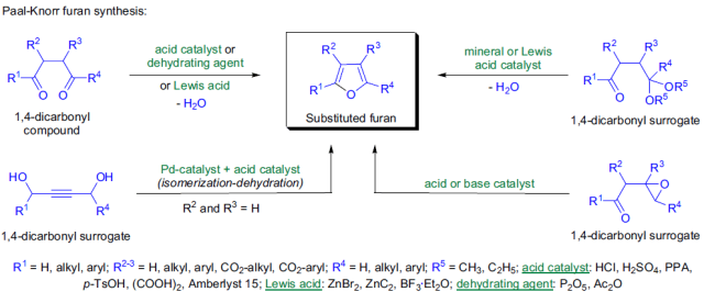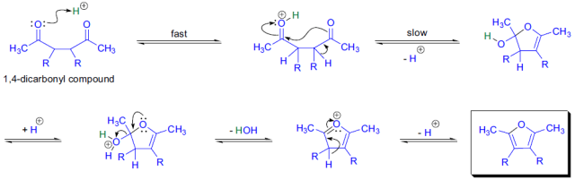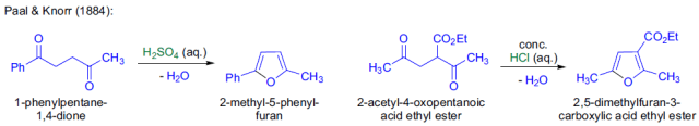 幾乎所有的1,4-二羰基化合物及其衍生物都可以參與反應;除了利用鹽酸和硫酸進行脫水,Lewis酸和脫水劑(P2O5等)也可用于脫水;該反應產率適中,但是有兩個主要缺點:很難得到1,4二羰基化合物,很多官能團對酸性條件太敏感。