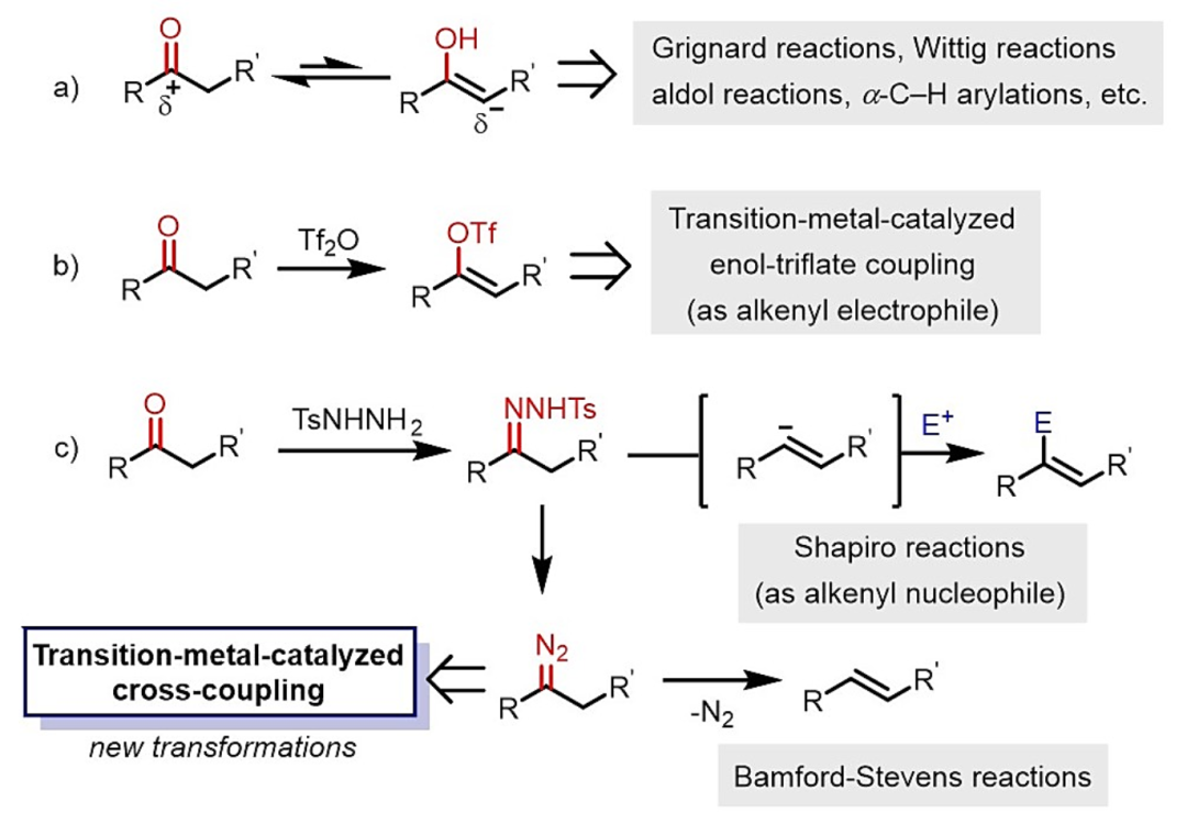 醛酮等羰基化合物作為最基本的化合物在有機合成中扮演著非常重要的角色。醛酮豐富的反應(yīng)活性主要來源于羰基碳的親電性和α-氫的酸性。例如,有機合成中應(yīng)用非常廣泛的反應(yīng),包括格式試劑加成反應(yīng)、魏悌息反應(yīng)、羥醛縮合反應(yīng)和α-碳氫鍵烷基化、芳基化反應(yīng)等等,都與醛酮的這些性質(zhì)相關(guān)。如果將醛酮轉(zhuǎn)化為相應(yīng)的三氟甲磺酸烯醇酯(-OTf),則其可以作為烯基親電試劑在過渡金屬催化下參與偶聯(lián)反應(yīng)。這是一類已發(fā)展完善的間接利用醛酮作為偶聯(lián)組分的方法。此外,通過將醛酮與對甲苯磺酰肼(TsNHNH2)簡單縮合得到的對甲苯磺酰腙(=NNHTs),也是一類非常重要的合成子,其可以經(jīng)由Shapiro反應(yīng)和Bamford-Stevens反應(yīng)得到官能團化的烯烴。特別是Shapiro反應(yīng)可以將酮轉(zhuǎn)化為烯基親核試劑來參與反應(yīng),這一特殊的轉(zhuǎn)化模式在有機合成中得到了很多應(yīng)用,例如,該反應(yīng)是紫杉醇全合成中的關(guān)鍵步驟之一。