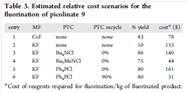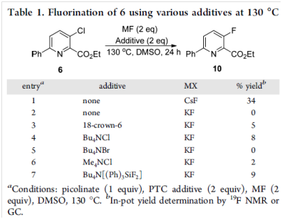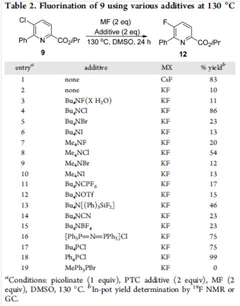 最近有人想到,可以往反應體系中加入相轉移催化劑(PTC, Phase Transfer Catalyst)促進反應氟鹵交換。說干就干,就拿CsF做參照系,通過給KF體系中加入各種相轉移催化劑看看能不能把CsF 干掉。Table1, 一頓操作猛如虎,干完才發現底物選的不合適,吡啶的C-3位置本身活性不高,不太適合親核取代反應。就連CsF也才給出34%的轉化率。但是至少看出來相轉移催化劑已經幫KF解決了從無到有的問題。