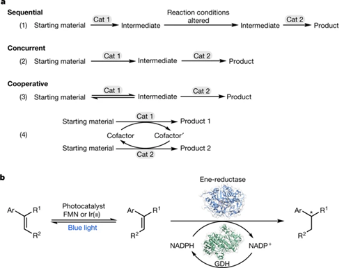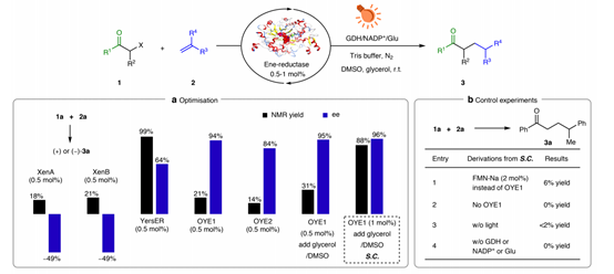 酶催化在不對稱有機合成中的應用正快速發展,酶催化的應用通常有局限性,只有天然存在的酶才能進行。最近光催化的發展顯示使用現有的酶能體現出不同的反應活性,但是通過酶催化對兩個分子之間的反應仍未見報道。