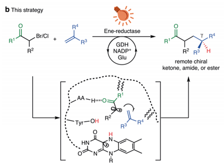 1. 通過烯還原酶/光協同催化系統,合成了常規化學合成方法難以得到的γ-位點上對映中心的羰基(酮、酰胺、酯)分子。