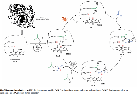傳統的烯還原酶(ene-reductase)的反應中不存在光的作用,通過雙電子還原反應進行,對羰基取代烯烴分子進行反應,該酶催化劑中通過組氨酸和天冬酰胺(或者兩個組氨酸)位點和分子中的羰基結合,酪氨酸(tyrosine)作為供氫分子,黃素單核苷酸氫醌FMN在和GDH/NADP+/葡萄糖反應過程中得以循環。