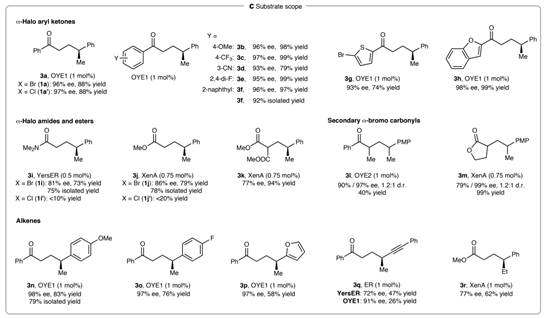 作者對α-溴代芳基酮的種類進行拓展,結果顯示多種底物都有較好的反應性,并且反應對芳環上的電子效應兼容,對不同電子效應的芳環底物以74~99 %的產率和93~98 % ee值得到γ-手性碳的酮。反應對包括1,3-二酯、酯、酰胺類的羰基官能團有兼容性。OYE1在芳基酮的反應中是效果最好的酶,YersER在酰胺中效果較好,XenA在酯的反應中效果最好。α-氯苯乙酮和溴化物的反應結果類似,但是α-氯酯、α-氯酰胺的反應活性比對應的溴化物反應活性更低。