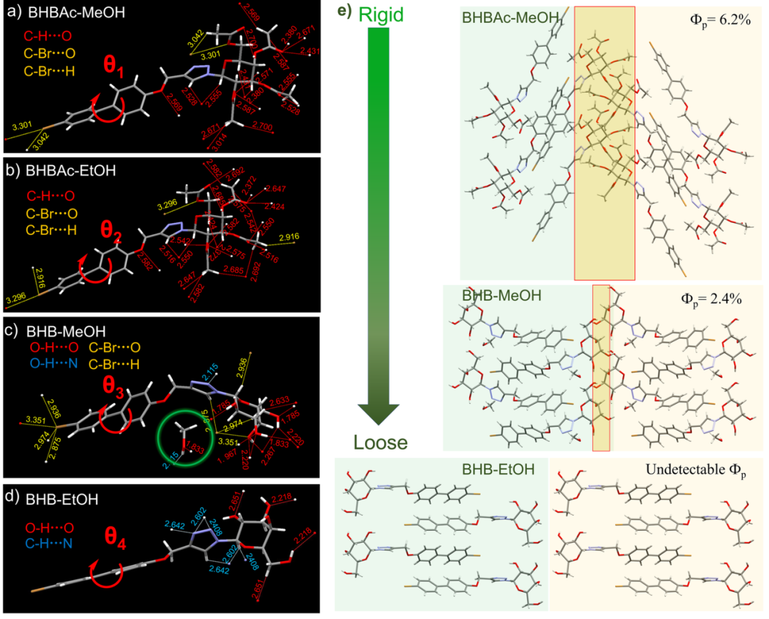 華東理工大學(xué)馬驤課題組將半乳糖基團(tuán)與含有聯(lián)苯骨架的磷光團(tuán)組合制備了一種具有扭曲結(jié)構(gòu)多元化合物BHB,并基于雙組分結(jié)晶 (溶劑化物)機(jī)制成功構(gòu)建了甲醇選擇性“開(kāi)/關(guān)”的室溫磷光體系,為開(kāi)發(fā)溶劑識(shí)別室溫磷光(RTP)材料及新型智能RTP材料的構(gòu)建開(kāi)辟了新途徑。