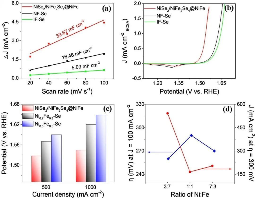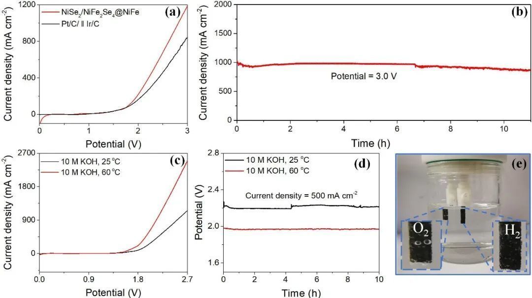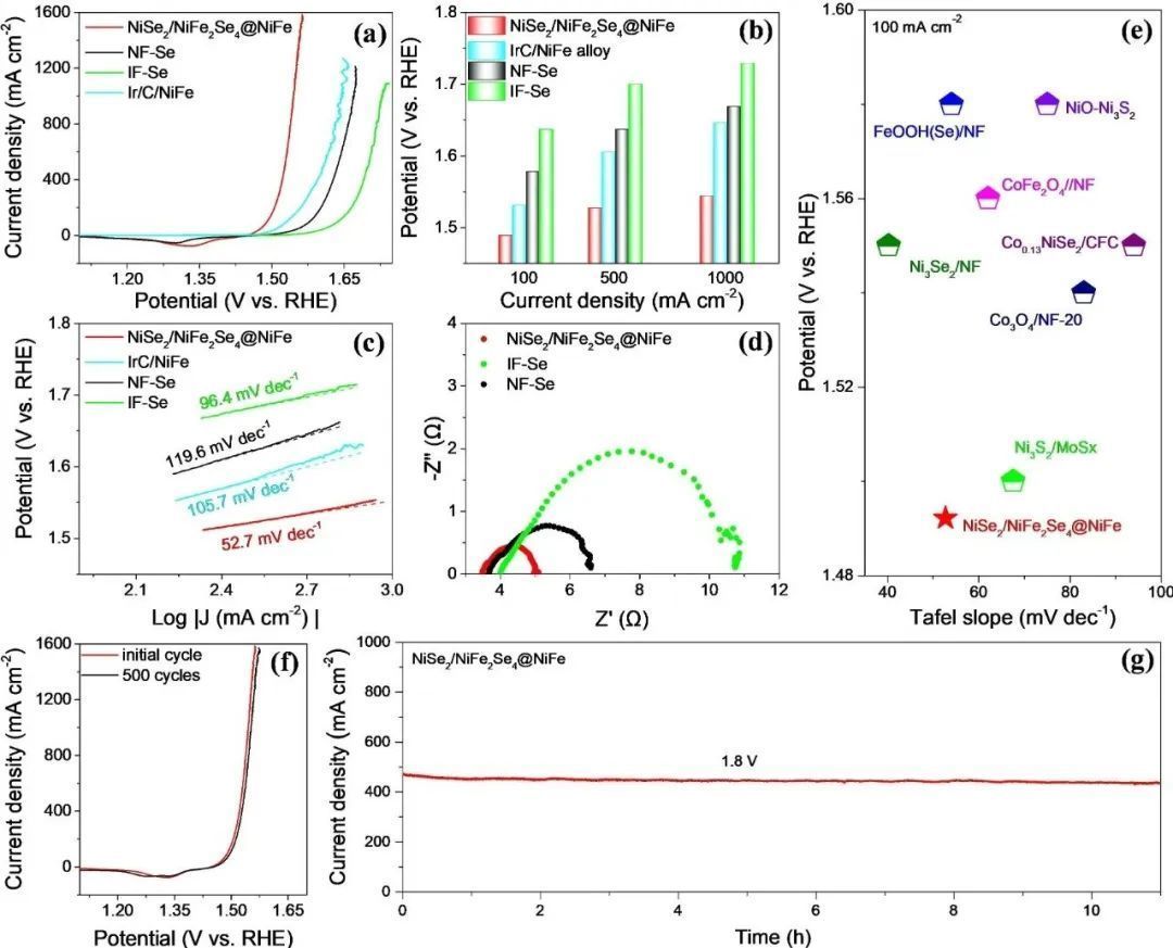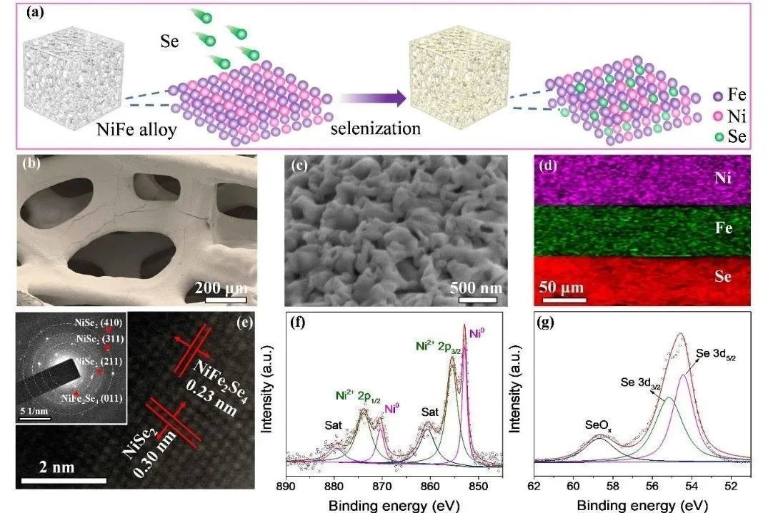 近年來,過渡金屬硒化物材料已經(jīng)成為一種有前景的電催化水裂解析氧催化劑,但是,目前過渡金屬硒化物材料存在著導(dǎo)電率低,穩(wěn)定性差等問題,嚴(yán)重阻礙了金屬硒化物材料在電催化水裂解制氫和氧領(lǐng)域的實際發(fā)展和應(yīng)用。浙江大學(xué)化工學(xué)院侯陽研究員聯(lián)合澳大利亞阿德萊德大學(xué)王少彬教授課題組通過簡單的一步熱硒化策略成功在三維鎳鐵(3D-NiFe)合金骨架上制備出由NiSe2和NiFe2Se4納米褶皺組成的雙過渡金屬硒化物三維異質(zhì)結(jié)構(gòu)電催化劑。NiSe2/NiFe2Se4納米褶皺的厚度約為100 nm。基于高導(dǎo)電性和高比表面積,NiSe2/NiFe2Se4@NiFe異質(zhì)結(jié)構(gòu)催化劑在500和1000 mA/cm2高電流密度下的應(yīng)用電勢分別僅為1.53和1.54 V,明顯優(yōu)于幾乎所有先前報道的鎳/鐵基硒化物材料,甚至優(yōu)于商業(yè)Ir/C催化劑。通過原位電化學(xué)光譜發(fā)現(xiàn),在NiSe2/NiFe2Se4@NiFe異質(zhì)結(jié)構(gòu)催化劑中,F(xiàn)eOOH和NiOOH是真正的活性中心。此外,NiSe2/NiFe2Se4@NiFe異質(zhì)結(jié)構(gòu)催化劑超疏氣的特性可以促進原位生成O2氣泡的快速釋放,從而減少電催化水裂解析氧反應(yīng)過程中的負面效應(yīng)。此外,作為一種雙功能電催化劑,NiSe2/NiFe2Se4@NiFe異質(zhì)結(jié)構(gòu)能夠在60 ℃溫度下10.0M的KOH電解液中表現(xiàn)出優(yōu)異的水裂解析氧和析氫電催化活性,在2.17 V的低電壓下即可驅(qū)動高達1000 mA/cm2的電流密度。I NiSe2/NiFe2Se4@NiFe的結(jié)構(gòu)特征