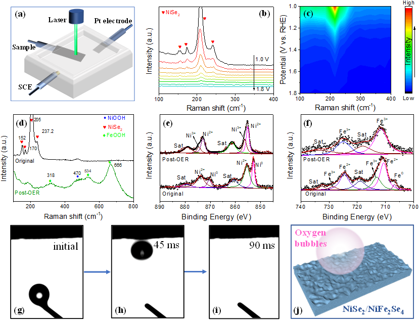 圖1a表現(xiàn)了三維NiSe2/NiFe2Se4@NiFe異質(zhì)結(jié)構(gòu)合成的簡單熱硒化過程。在含硒蒸汽下,三維NiFe合金在300 ℃溫度下退火煅燒2 h,得到NiSe2/NiFe2Se4@NiFe。場發(fā)射掃描電子顯微鏡(FESEM)顯示,經(jīng)過熱硒化處理后,3D NiSe2/NiFe2Se4@NiFe的空間骨架形態(tài)仍然存在(圖1b-1c)。高分辨率透射電鏡(HRTEM)圖像和X射線光電子能譜(XPS)均表明了NiSe2/NiFe2Se4@NiFe異質(zhì)結(jié)構(gòu)中NiSe2和NiFe2Se4物相的共存。圖1. (a) NiSe2/NiFe2Se4@NiFe一步制備策略示意圖。(b-c) NiSe2/NiFe2Se4@NiFe的FESEM圖像。(d) EDX元素映射NiSe2/NiFe2Se4@NiFe中Ni、Fe和Se元素的圖像。(e) NiSe2/NiFe2Se4@NiFe的HRTEM圖像;插圖:相應(yīng)的SAED圖案。NiSe2/NiFe2Se4@NiFe的(f) Ni 2p和(g) Se 3d高分辨率XPS光譜。II NiSe2/NiFe2Se4@NiFe的電化學(xué)性能在1.0 M KOH堿性電解質(zhì)溶液中,所制備的NiSe2/NiFe2Se4@NiFe異質(zhì)結(jié)構(gòu)材料具有良好的電催化水裂解析氧性能,在電流密度100 mA/cm2時,其應(yīng)用電勢僅為1.49 V,塔菲爾斜率為52.7 mV/dec,雙電層電容為33.67 mF/cm,均優(yōu)于Ni-Se和IF-Se對照樣品,及其商業(yè)貴金屬Ir/C電催化劑,并展現(xiàn)出優(yōu)良的電催化活性和穩(wěn)定性。圖2. (a) 極化曲線圖;(b) 電勢柱狀圖(電流密度100 mA cm-2, 500 mA cm-2,1000 mA cm-2);(c) Tafel曲線圖;(d) 電化學(xué)阻抗譜圖;(e) 比較100 mA cm-2所需的塔菲爾斜率和電位;(f) 經(jīng)過500次循環(huán)后,NiSe2/NiFe2Se4@NiFe的極化曲線;(g) 穩(wěn)定性測試。圖3. (a) NiSe2/NiFe2Se4@NiFe,NF-Se和IF-Se的ECSAs。(b) NiSe2/NiFe2Se4@NiFe, NF-Se和IF-Se的ECSA歸一化極化曲線。(c) NiSe2/NiFe2Se4@NiFe, Ni0.7Fe0.3-Se和Ni0.5Fe0.5-Se在500和1000 mA cm-2時的電位對比。(d) NiSe2/NiFe2Se4@NiFe,Ni0.7Fe0.3-Se和Ni0.5Fe0.5-Se在100 mA cm-2和300 mV時電催化水裂解析氧活性。III NiSe2/NiFe2Se4@NiFe異質(zhì)結(jié)構(gòu)催化機理的研究通過原位電化學(xué)拉曼光譜和拉曼光譜分析,觀察到在電催化水裂解析氧反應(yīng)過程中NiOOH和FeOOH中間物種的生成。結(jié)合X射線光電子能譜分析,結(jié)果表明原位獲得的非晶FeOOH和NiOOH在電催化水裂解析氧過程中是NiSe2/NiFe2Se4@NiFe的催化活性中心。此外,通過接觸角測試,發(fā)現(xiàn)NiSe2/NiFe2Se4@NiFe異質(zhì)結(jié)構(gòu)催化劑擁有超疏氣的特性,可以促進電催化水裂解析氧反應(yīng)過程中原位生成氧氣氣泡的快速釋放,從而減少催化反應(yīng)過程中的負面效應(yīng)。圖4. (a) 原位電化學(xué)拉曼光譜示意圖。(b) 原位拉曼光譜和(c) 不同電位下電催化劑的相應(yīng)等值線圖。(d) 拉曼光譜。(e-f) XPS光譜。(g-i) 氧氣氣泡示意圖。(j) 電催化劑上氧氣氣泡粘附行為示意圖。作為一種雙功能電催化劑,NiSe2/NiFe2Se4@NiFe異質(zhì)結(jié)構(gòu)在25℃溫度下的1.0 M KOH電解液中,在電流密度500 mA/cm2時,其應(yīng)用電勢為2.32 V,優(yōu)于商業(yè)貴金屬Pt/C-Ir/C電催化劑,并展現(xiàn)出優(yōu)良的電催化水裂解析氧和析氫催化活性和穩(wěn)定性。NiSe2/NiFe2Se4@NiFe異質(zhì)結(jié)構(gòu)可以在60 ℃溫度下的10.0 MKOH電解液中,表現(xiàn)出優(yōu)異的水裂解催化活性,在2.17 V的低電壓下,即可驅(qū)動高達1000 mA/cm2的電流密度。圖5. (a) 全水解極化曲線。(b) 穩(wěn)定性測試。(c) 不同溫度下的全水解極化曲線。(d) 不同溫度下的穩(wěn)定性測試。(e) 電催化劑表面生成的氧氣和氫氣氣體的數(shù)字圖像。高性能鎳鐵基材料的設(shè)計合成及其工業(yè)級電催化析氧應(yīng)用。在Nano Micro Letters和Engineering期刊以第一作者發(fā)表學(xué)術(shù)論文2篇。ground-image: none; background-clip: border-box; background-position: 0% 0%; background-repeat: repeat; background-size: auto; border-width: 0px; border-style: none; border-color: rgb(51, 51, 51); bottom: auto; float: none; height: auto; left: auto; max-height: none; min-width: 0px; text-decoration-style: solid; text-decoration-color: rgb(51, 51, 51); top: auto; z-index: auto; visibility: visible; clear: none;">新型二維微納米結(jié)構(gòu)功能材料設(shè)計與構(gòu)建;新型電化學(xué)催化劑及轉(zhuǎn)能技術(shù)(電解水制氫、二氧化碳還原、合成氨等);光電催化水分解制備氫氣和氧氣;電化學(xué)儲能材料及器件(鋰/鈉離子電池、離子電容器、空氣電池等);新型碳功能材料的合成及儲能、催化應(yīng)用。迄今為止,已在Nat. Commun., J. Am. Chem. Soc., Angew. Chem. Int. Ed., Energy Environ. Sci., Adv. Mater., Nano Lett., Nano Today等國際權(quán)威期刊上發(fā)表學(xué)術(shù)論文130余篇(包括邀請綜述及,專題論文)。論文總被引用超過9,200余次,H因子為52。其中,24篇入選ESI高被引和ESI熱點論文。15篇論文被選為熱點文章、VIP論文、封面、卷首插圖、十大熱門文章以及月度最受關(guān)注論文和月度最熱門下載論文。20余篇論文被Advanced Science News, Chemistryview, Nanotechnology Weekly, Materialsviewschina, High Beam Research, Nanowerk等科技媒體和網(wǎng)站予以專題報道。申請/授權(quán)美國發(fā)明1項和中國國家專利9項。https://person.zju.edu.cn/yhou#0主要研究方向為納米材料的合成及其在吸附催化、燃料與能源轉(zhuǎn)化、環(huán)境修復(fù)等方面的應(yīng)用。發(fā)表論文400余篇,被引頻次35000余次,h指數(shù)105。2012年獲澳大利亞湯森路透嘉獎與創(chuàng)新獎。他也是2016年、2017年、2018年和2019年化學(xué)/環(huán)境工程領(lǐng)域被高度引用的研究人員。他是幾家國際期刊的編委會成員。https://www.researchgate.net/profile/Shao