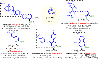 圖一、CBL/Ir催化的環(huán)狀胺的不對稱碳氫鍵硼化反應最近,他們通過改造的CBL,實現(xiàn)了環(huán)狀胺類化合物的高區(qū)域和立體選擇性的α-C(sp3)-H鍵硼化反應,產(chǎn)物的最高ee值可達98%(圖一),并實現(xiàn)了生物活性分子(+)-Calycotomine的對映選擇性合成。值得一提的是,在四氫異喹啉類底物的反應中,硼化反應專一性地發(fā)生在C1位,這與從文獻已知的碳氫鍵活化方法形成互補。利用該方法,該團隊也實現(xiàn)了一系列含有生物活性分子的環(huán)狀胺類化合物的后期碳氫鍵硼化反應(圖二)。