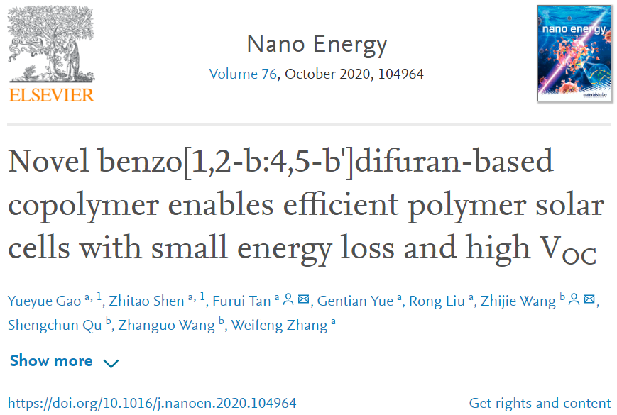 近日,河南大學光伏材料省重點實驗室譚付瑞課題組在聚合物太陽能電池方面的研究取得最新成果,該工作以“Novel benzo[1,2-b:4,5-b']difuran-based copolymer enables efficient polymer solar cells with small energy loss and high VOC”為題,發表在國際能源領域頂級期刊《Nano Energy》(影響因子16.606)。