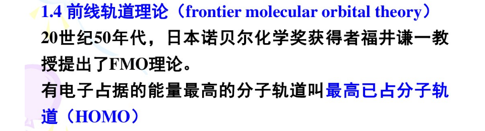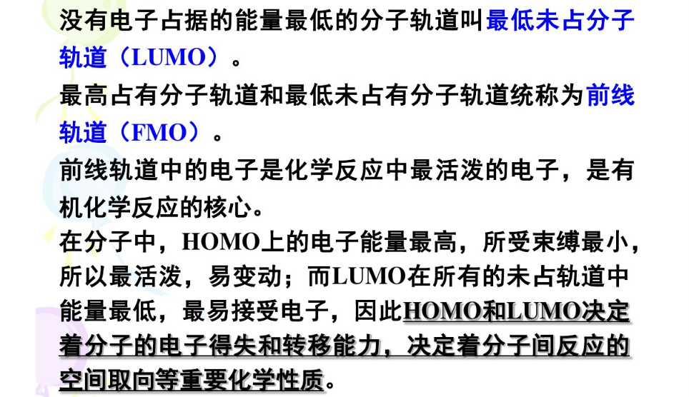 福井謙一提出這一理論,它的依據(jù)是:在分子中,HOMO上的電子能量最高,所受束縛最小,所以最活潑,容易變動(dòng);而LUMO在所有的未占軌道中能量最低,最容易接受電子,因此這兩個(gè)軌道決定著分子的電子得失和轉(zhuǎn)移能力,決定著分子間反應(yīng)的空間取向等重要化學(xué)性質(zhì)