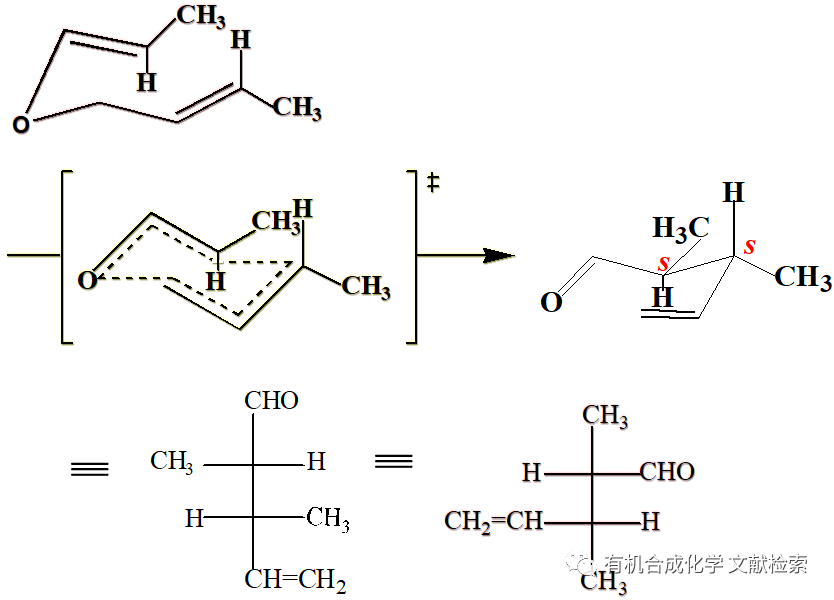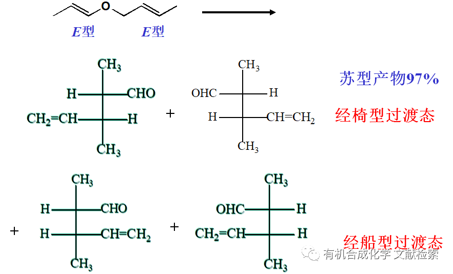 [3,3] σ-遷移反應(yīng)要經(jīng)過一個六元環(huán)狀過渡態(tài),該過渡態(tài)不是以平面結(jié)構(gòu)形式存在的,一般都是取比較穩(wěn)定的椅型結(jié)構(gòu)形式為過渡態(tài)