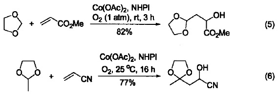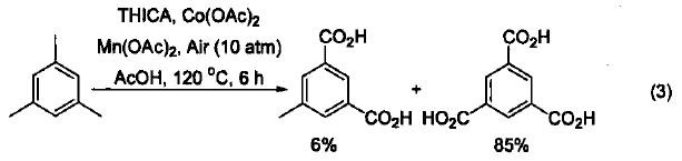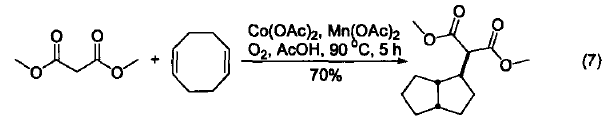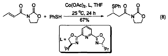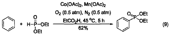 在有機合成中,醋酸鈷很少單獨使用。當它與其它試劑搭配使用 [例如:O2、Mn(OAc)2、N-hydroxyphthalimide (NHPI)]時,可以應用于多種官能團的氧化以及C-C、C-S和C-P鍵的形成反應。 在二氧化硅負載的醋酸鈷的催化下,叔丁基過氧化氫能高效地把類固醇的烯丙基碳氫鍵氧化成為羰基,得到α,β-不飽和化合物(式 1 )[1]。這種方法中的催化劑可以回收重復使用,與CrO3、氯鉻酸吡啶鹽酸鹽( PCC )及重鉻酸吡啶鹽( PDC )等傳統氧化試劑相比較,具有反應更易處理和對環境危害小的優點。 在室溫下,Co(OAc)/O2/NHPI體系可以把多取代吡唑啉氧化生成相應的吡唑。這類化合物具有多種生物活性(式2)[2]。 在Co(OAc)2和Mn(OAc)2存在下,利用三羥基異氰尿酸(THICA)在空氣中可以使均三甲苯發生氧化。通過改變Co(II)/Mn(II)的比例以及空氣的壓力,可以高產率和高選擇性地得到用于合成聚酯材料的均三苯甲酸(式3)[3]。 在比較溫和的條件下,用離子液體[bmim][PF6]作溶劑,Co(OAc)2/O2/NHPI體系可以選擇性地氧化二羥基化合物中的仲羥基(式4)[4]。 在Co(OAc)2和NHPI的催化下,氧氣能活化1,3-二噁烷的C-H鍵。在丙烯酸甲酯的存在下,該反應可以構筑新的C-C鍵得到合成內酯 的中間體(式5)[5]。在相似條件下,2-甲基-1,3-二噁烷與丙烯腈也能發生此類反應(式6)[6]。 在Co(OAc)2/Mn(OAc)2復合體系的催化下,氧氣能使含活潑亞甲基的化合物產生自由基,然后與烯烴發生加成反應。在此條件下,1,3-丙二酸二甲酯與1,5-環辛二烯首先進行自由基加成,然后再發生分子內的自由基成環反應,最后脫氫可生成二環化合物(式7)[7]。 在手性配體誘導下,Co(OAc)2可以把硫酚加成到α,β-不飽和酮上形成新的C-S鍵(式8)[8]。 Mn(OAc)2/Co(OAc)2/O2復合體系能夠引發亞磷酸二乙酯產生磷自由基。該自由基直接加成到苯環的雙鍵后,再脫去一個氫原子就得到苯基取代的亞磷酸二乙酯。此類化合物是合成殺蟲劑和生物活性分子的重要中間體,用傳統方法很難制備,Co(OAc)2參與的催化反應突破了這一難題(式9)[9]。 參考文獻 1. Salvador, J. A. R.; Clark, J. H. Chem. Commun. 2001,33. 2. Han, B.; Liu, Z.; Liu, Q.; Yang, L.; Liu, Z.; Yu, W. Tetrahedron 2006,62,2492. 3. Hirai, N.; Tatsukawa, Y.;Kameda, M,; Sakaguchi, S.; Ishii, Y. Tetrahedron 2006,62,6695. 4. Koguchi, S.; Kitazume, T. Tetrahedron Lett. 2006,47,2797. 5. Kagayama, T.; Sakaguchi, S.; Ishii, Y. Tetrahedron Lett. 2005,46,3687. 6. Hirano, K.; Iwahama, T.; Sakaguchi, S.; Ishii, Y. Chem. Commun. 2000,2457. 7. Hirase,K.; Iwahama, T.; Sakaguchi, S.;-lshii, Y. J. Org. Chem. 2002,67,970. 8. Kawatsura, M.; Komatsu, Y.; Yamamoto, M.; Hayase, S.; Itoh, T. Tetrahedron 2008, 64,3488. 9. Kagayama, T.; Nakano, A.; Sakaguchi, S.; Ishii, Y. Org. Lett 2006,8,407.