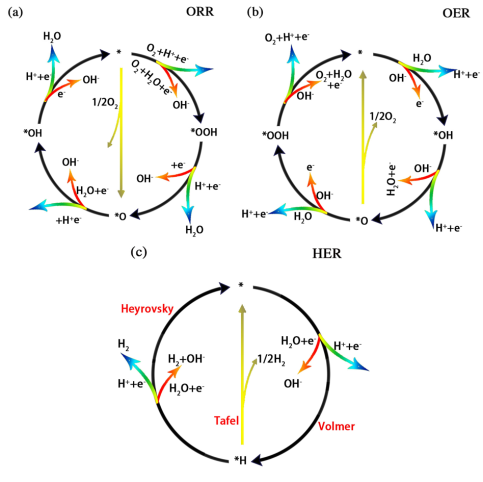 近日香港科技大學王健博士,Francesco CIUCCI教授協同中科院工程熱物理研究所,西安交通大學,南京工業大學多家合作單位系統綜述了碳基催化劑用于可持續能源轉化的最新(2015-2020年)進展,涵蓋多種碳材料系統,以及其合成方法,性能調控策略,催化機理和性能分析。相關成果以“Carbon-based Electrocatalysts for Sustainable Energy Applications”為題發表在材料學國際頂級期刊Progress in Materials Science (IF = 31.56) 上。文章首先介紹了ORR/OER/HER催化的基礎知識,包括反應基元步驟和性能評價指標。接著詳細地闡述了目前常用的碳基催化劑的合成方法,包擴熱解法,水熱法,化學沉積法,球磨法,電弧放電法,涵蓋每種制備方法的詳細過程,影響因素以及優缺點分析。此外,使用兩種特殊前驅體(生物質 (biomass)和金屬有機框架 (MOFs))來制備碳基催化劑得到了詳細的介紹。▲圖3. 酸性以及堿性溶液中ORR/OER/HER催化的基元步驟。