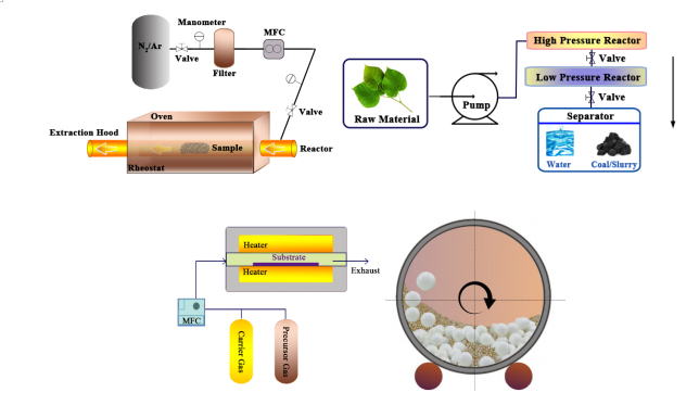 ▲圖4.合成碳材料的常見方法示意圖:熱解,水熱,化學沉積,和球磨。