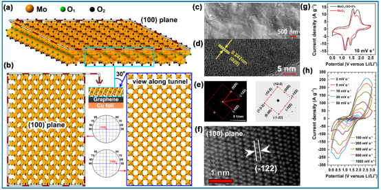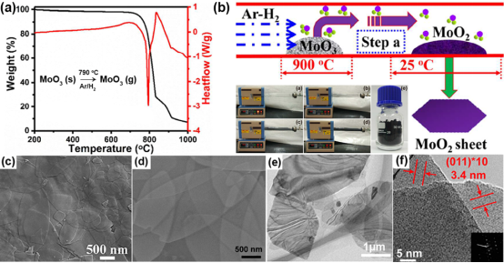 碳化鉬擁有與鉑貴金屬相似的d電子軌道結(jié)構(gòu),被稱為“類貴金屬催化劑”,鉬與非金屬元素的成鍵結(jié)構(gòu)決定了鉬基電催化劑的本征催化活性[Nano Energy, 2020, doi.org/10.1016/j.nanoen.2020.105056;Appl. Catal. B: Environ., 2020, 272, 118956;Nano Energy, 2019, 62, 338;Nano Energy, 2017, 41, 749]。我們課題組探討了三氧化鉬升華和氫氣還原的平衡反應(yīng)機(jī)理,提出了一種超薄MoO2納米片的快速、大量制備工藝,獲得了具有垂直孔道結(jié)構(gòu)[ACS Nano 2019, 138, 9091]和大量氧缺陷的催化劑載體[Nano Energy, 2019, 62,127];進(jìn)一步利用MoO2納米片,通過碳、氮源可控分解實(shí)現(xiàn)還原反應(yīng)、氮化反應(yīng)和碳化反應(yīng)的合理設(shè)計(jì),系統(tǒng)研究了碳化鉬的表面原子排布結(jié)構(gòu)與電催化活性的構(gòu)效關(guān)系,實(shí)現(xiàn)鉬基電催化劑催化位點(diǎn)的調(diào)控,明確了二維納米結(jié)構(gòu)有利于鉬催化位點(diǎn)的暴露[ACS Nano, 2017, 11, 12509];同時(shí),發(fā)現(xiàn)了碳化鉬納米片形成過程中,氮元素的引入有利于釕納米顆粒的反向奧斯特瓦爾德成熟過程,獲得釕單原子負(fù)載的氮摻雜碳化鉬納米片[Applied Catalysis B: Environmental, 2020, 277, 119236];最后,MoO2納米片通過原位轉(zhuǎn)化反應(yīng)和自模板作用,合成了CdS/MoS2/Mo[Appl. Catal. B: Environ., 2017, 210 290]和CdS-Cd/S-MoO2[ACS Appl. Mater. Interfaces, 2020, 12, 2, 2362]異質(zhì)結(jié)構(gòu)催化劑,獲得了高的光催化產(chǎn)氫活性。濟(jì)南大學(xué)周偉家&劉宏課題組與合作者近期基于MoO2納米片及其鉬衍生物在能源轉(zhuǎn)化與存儲(chǔ)領(lǐng)域的研究進(jìn)展如下。[MoO2納米片]:超薄二維結(jié)構(gòu)、具有大量垂直孔道和氧空位如圖1所示,通過MoO3粉末的差熱熱重分析可以得到,MoO3的升華溫度在790 ℃附近。基于這個(gè)特點(diǎn),我們開發(fā)了一種大批量可控合成超薄MoO2納米片的方法。具體的,通過快速的升溫到達(dá)MoO3的揮發(fā)溫度,在大流量的Ar-H2氣氛下MoO3蒸汽發(fā)生還原成MoO2,當(dāng)?shù)竭_(dá)尾端時(shí)冷卻時(shí)快速形核長大得到超薄MoO2納米片,獲得了具有垂直孔道結(jié)構(gòu)和大量氧缺陷的MoO2納米片。通過調(diào)控氫氣的還原反應(yīng)與MoO3升華反應(yīng)的平衡關(guān)系,可以實(shí)現(xiàn)MoO2納米片和金屬M(fèi)o納米片的可控制備[授權(quán)專利:ZL201610828412.3;ACS Appl. Mater. Interfaces, 2017, 9, 8041]。[研究成果一] 基于MoO2垂直孔道結(jié)構(gòu)的超級電容器研究▲圖2. 基于二維MoO2的定向隧道實(shí)現(xiàn)的超級電容器的快速儲(chǔ)能。
