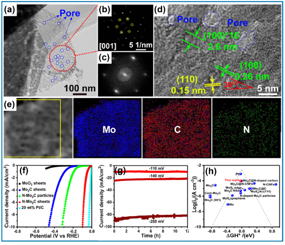高效析氫反應(yīng)(HER)電催化劑在可再生能源領(lǐng)域中起重要作用。盡管在尋找替代材料方面付出了巨大努力,但Pt仍然是最有效的HER電催化劑。因此,電催化劑中最小化Pt的負(fù)載量對于降低催化劑成本具有重要意義。由于MoO2納米片具有大量的氧空位,在此,通過室溫光還原法結(jié)合氧空位錨定Pt簇均勻分散在MoO2納米片上的電催化劑(0.5 wt% Pt Cs/MoO2 NSs-L)表現(xiàn)出優(yōu)異的HER活性。結(jié)合SEM、TEM、HAADF-STEM和Mapping可以證實(shí)鉑以納米簇負(fù)載在超薄二氧化鉬納米片上(圖3)。通過對不同鉑負(fù)載量催化劑的Pt 4f高分辨XPS分析,光還原過程將鉑簇錨定在空位中僅僅促進(jìn)團(tuán)簇變大,熱還原過程沒有選擇性,鉑的含量逐漸增加。進(jìn)一步證實(shí)鉑的存在,且具有還原選擇性。在過電位為50 mV下,0.5 wt%Pt Cs/MoO2 NSs-L(12.2 mA/cm2)的電流密度接近于20 wt%Pt/C的電流密度(20 mA/cm2),但是0.5wt%Pt Cs/MoO2 NSs-L的質(zhì)量比活性(7.43 A/mg)比20wt%Pt/C(0.28A/mg)提高了26.5倍。密度函數(shù)理論計(jì)算證實(shí)錨定在MoO2的氧空位上Pt的H*的吸附/解吸性能顯著得到改善。本工作證明了通過室溫光還原法結(jié)合氧缺陷錨定來制備高效HER電催化劑的可行性。相關(guān)結(jié)果發(fā)表在Nano Energy, 2019, 62, 127。Confined distribution of platinum clusters on MoO2 hexagonal nanosheets with oxygen vacancies as a high-efficiency electrocatalyst for hydrogen evolution reaction, Nano Energy 2019, 62, 127。共同第一作者:李曉、余加源; 通訊作者:周偉家、劉宏。[研究成果三] 基于MoO2超薄二維結(jié)構(gòu)的原位相轉(zhuǎn)化合成N-Mo2C及電解水產(chǎn)氫性能研究▲圖4. N-Mo2C的結(jié)構(gòu)表征及電解水產(chǎn)氫性能研究