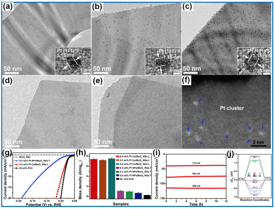 雖然贗電容比雙電層電容電極具有存儲(chǔ)更多能量的潛力,但其充放電速率往往受到法拉第反應(yīng)遲緩動(dòng)力學(xué)或較差的電子和離子電導(dǎo)率的限制。與大多數(shù)過渡金屬氧化物不同,MoO2由于其異常高的電子和離子導(dǎo)電性,是一種非常有前途的快速儲(chǔ)能材料,其一維隧道是理想的快速離子傳輸通道。如圖2所示,本研究中,我們制備和表征具有定向隧道的超薄MoO2片作為快速電荷存儲(chǔ)/釋放贗電容電極。MoO2和5 wt% GO組成一個(gè)復(fù)合電極,通過電化學(xué)測試得到在2 mV s?1和1000 mV s?1下的容量分別為1097 C g?1和390 C g?1,50 mV s?1的掃速下10000次后仍然保持~80%的初始容量,其高穩(wěn)定性是由于MoO2充電/放電期間結(jié)構(gòu)基本沒有發(fā)生變化,除了體積變化~14%。此外,循環(huán)過程中的體積變化是高度可逆的,這意味著MoO2電極具有超高的結(jié)構(gòu)穩(wěn)定性和長循環(huán)壽命。相關(guān)結(jié)果發(fā)表在ACS Nano 2019, 138, 9091。Fast Energy Storage in Two-Dimensional MoO2 Enabled by Uniform Oriented Tunnels,ACS Nano 2019, 13, 8, 9091共同第一作者:朱元元、季旭; 通訊作者:周偉家、程爽、劉美林。[研究成果二] 基于MoO2氧空位實(shí)現(xiàn)Pt納米團(tuán)簇的可控合成及電解水產(chǎn)氫研究▲圖3. MoO2氧空位錨定Pt納米團(tuán)簇的結(jié)構(gòu)表征及電解水產(chǎn)氫研究。