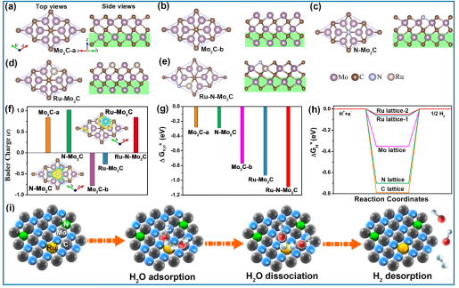 ▲圖6. 理論計(jì)算揭示N-Mo2C納米片錨定Ru單原子協(xié)同增強(qiáng)電解水產(chǎn)氫機(jī)理。金屬釕具有與鉑相似的化學(xué)性質(zhì),但其價(jià)格僅為其鉑的1/40,因而是潛在的理想電解水產(chǎn)氫催化劑。負(fù)載型釕基催化劑在制備過程中的不可逆燒結(jié)嚴(yán)重影響了其產(chǎn)氫活性和穩(wěn)定性。如圖5所示,在實(shí)現(xiàn)MoO2原位相轉(zhuǎn)化為N-Mo2C的過程中同時(shí)合成單原子Ru。本研究中通過反向奧斯特瓦爾德熟化過程,利用超薄氮摻雜碳化鉬納米片(N-Mo2C NSs)作為穩(wěn)定釕單原子(SAs)位點(diǎn)的多功能載體。N摻雜可以調(diào)控Ru原子與Mo2C NSs之間的結(jié)合,使得Ru SAs被均勻的錨定在N-Mo2C NSs載體中。通過球差校正透射電子顯微鏡(AC HAADF-STEM)和X射線吸收精細(xì)結(jié)構(gòu)(XAFS)測量,證實(shí)了Ru SAs的存在。電化學(xué)測試中發(fā)現(xiàn),Ru SAs/N-Mo2C NSs在1.0 M KOH中具有優(yōu)異的產(chǎn)氫性能,10 mA/cm2對應(yīng)的過電位為43 mV,并且具有良好的催化穩(wěn)定性。更為重要的是,在過電位為100 mV時(shí),Ru SAs/N-Mo2C NSs的質(zhì)量活度為6.44 A/mgRu,遠(yuǎn)遠(yuǎn)高于20 wt% Pt/C (0.91 A/mgPt)。理論計(jì)算進(jìn)一步表明,Ru SAs/N-Mo2C NSs的高HER活性來源于H2O的協(xié)同加速解離和Mo-Ru界面上H的優(yōu)化吸附強(qiáng)度。本工作為合理設(shè)計(jì)支持相互作用的HER單原子電催化劑提供了新的方向。相關(guān)結(jié)果發(fā)表在Applied Catalysis B: Environmental, 2020, 227, 119236.Tailoring the ruthenium reactive sites on N doped molybdenum carbide nanosheets via the anti-Ostwald ripening as efficient electrocatalyst for hydrogen evolution reaction in alkaline media, Applied Catalysis B: Environmental 2020, 277, 119236共同第一作者:余加源、王愛珠、郁萬強(qiáng); 通訊作者:周偉家、胡勇有、吳宇恩。通過氫氣還原與氧化鉬升華平衡反應(yīng),實(shí)現(xiàn)了二氧化鉬納米片的批量化制備;發(fā)現(xiàn)了二氧化鉬納米片具有垂直開放孔道結(jié)構(gòu),有利于鋰離子快速嵌入脫出;發(fā)現(xiàn)了二氧化鉬納米片具有大量的氧缺陷,限制了Pt納米團(tuán)簇異常長大,獲得了高的質(zhì)量電催化活性;提出了利用二氧化鉬超薄納米片作為模板和鉬源原位轉(zhuǎn)化多孔單晶氮摻雜碳化鉬納米片的工藝,揭示了碳化鉬晶面顯露與電催化活性的構(gòu)效關(guān)系;同時(shí)探討了氮元素?fù)诫s對于釕納米顆粒在碳化鉬碳化過程中的反向奧斯特瓦爾德熟化機(jī)理,獲得了釕單原子負(fù)載的氮摻雜碳化鉬納米片電催化劑。相關(guān)系列研究相繼發(fā)表在Nano Energy,ACS NANO, Applied Catalysis B: Environmental等高水平期刊上,對于研究碳化鉬納米結(jié)構(gòu)與其電催化產(chǎn)氫活性的構(gòu)效關(guān)系就有一定的指導(dǎo)意義。周偉家,男,濟(jì)南大學(xué)前沿交叉科學(xué)研究院教授,博士生導(dǎo)師,入選“泰山學(xué)者青年專家計(jì)劃”和“省自然科學(xué)杰出青年基金”。主要從事納米材料與技術(shù)在電催化、氫能源和微納器件等領(lǐng)域的研究,以第一或通訊作者在Energy Environ. Sci.、Angew. Chem. Int. Ed.、ACS Nano、Adv. Funct. Mater.、Nano Energy等期刊發(fā)表SCI收錄論文50余篇,被他引3868次(Web of Sci.),H因子36, ESI高被引用論文15篇,“全球高被引科學(xué)家”(交叉學(xué)科)(2018年),中國百篇最具影響力國際學(xué)術(shù)論文1篇;授權(quán)發(fā)明專利6項(xiàng)。劉宏,男,國家杰出青年科學(xué)基金獲得者,國家重點(diǎn)研發(fā)計(jì)劃項(xiàng)目首席科學(xué)家。中國硅酸鹽學(xué)會(huì)晶體生長分會(huì)理事,中國光學(xué)學(xué)會(huì)材料專業(yè)委員會(huì)會(huì)員理事,中國材料研究學(xué)會(huì)納米材料與器件分會(huì)理事。主要研究方向:納米能源材料、組織工程與干細(xì)胞分化、人工晶體材料等。十年來,承擔(dān)了包括國家重點(diǎn)研發(fā)專項(xiàng)、863、973、自然基金重大項(xiàng)目在內(nèi)的十余項(xiàng)國家級科研項(xiàng)目,取得了重要進(jìn)展。2004至今,在包括Adv. Mater., Nano Letters,ACS Nano,J. Am. Chem. Soc,Adv. Fun. Mater,Environ. Energy. Sci.,等學(xué)術(shù)期刊上發(fā)表 SCI文章 200余篇,其中,影響因子大于10的近30篇,個(gè)人文章總被引次數(shù)超過9600次,H因子為46,17篇文章被Web of Science的ESI(Essential Science Indicators)選為“過去十年高被引用論文”(Highly Cited Papers (last 10 years)), 文章入選2013年中國百篇最具影響國際學(xué)術(shù)論文,2015年度進(jìn)入英國皇家化學(xué)會(huì)期刊“Top 1%高被引中國作者”榜單,2018年又入“全球高被引科學(xué)家(材料科學(xué))”榜單。應(yīng)邀在化學(xué)頂尖期刊Chemica Slociety Review和材料頂尖期刊Advanced Materials和Advanced Energy Materials上發(fā)表綜述性學(xué)術(shù)論文,在國際上產(chǎn)生重要影響。授權(quán)專利30余項(xiàng),研究成果已經(jīng)在相關(guān)產(chǎn)業(yè)得到應(yīng)用。胡勇有,男,現(xiàn)任華南理工大學(xué)環(huán)境與能源學(xué)院國家二級教授,博士生導(dǎo)師,華南理工大學(xué) “興華人才工程”環(huán)境工程學(xué)科帶頭人,市政工程二級學(xué)科負(fù)責(zé)人,2001年享受國務(wù)院政府特殊津特(3600232號);2010年入選”廣東省千百十”國家級梯隊(duì)人才。國家自然科學(xué)基金評審專家,多次被邀請作為專家參加國家獎(